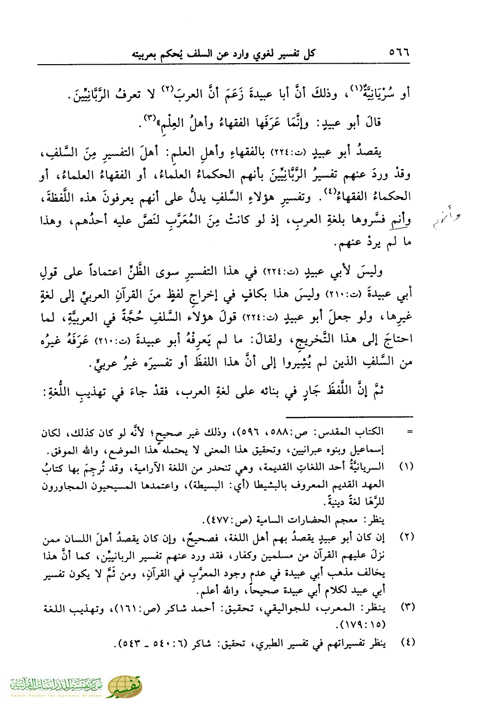 (¬2) إن كان أبو عبيدٍ يقصدُ بهم أهل اللغة، فصحيحٌ، وإن كان يقصدُ أهلَ اللسان ممن نزلَ عليهم القرآن من مسلمين وكفار، فقد ورد عنهم تفسير الربانييِّن، كما أنَّ هذا يخالف مذهب أبي عبيدة في عدم وجود المعرَّبِ في القرآنِ، ومن ثَمَّ لا يكون تفسير أبي عبيد لكلام أبي عبيدة صحيحاً، والله أعلم.