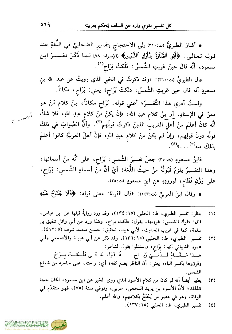 * أشارَ الطبريُّ (ت:310) إلى الاحتجاجِ بتفسيرِ الصَّحابيِّ في اللُّغةِ عند قولِه تعالى: {أَقِمِ الصَّلاَةَ لِدُلُوكِ الشَّمْسِ} [الإسراء: 78] لما ذَكَرَ تفسيرَ ابن مسعود، أنَّه قالَ حينَ غربتِ الشَّمسُ: دَلَكتْ بَرَاحِ (¬1).