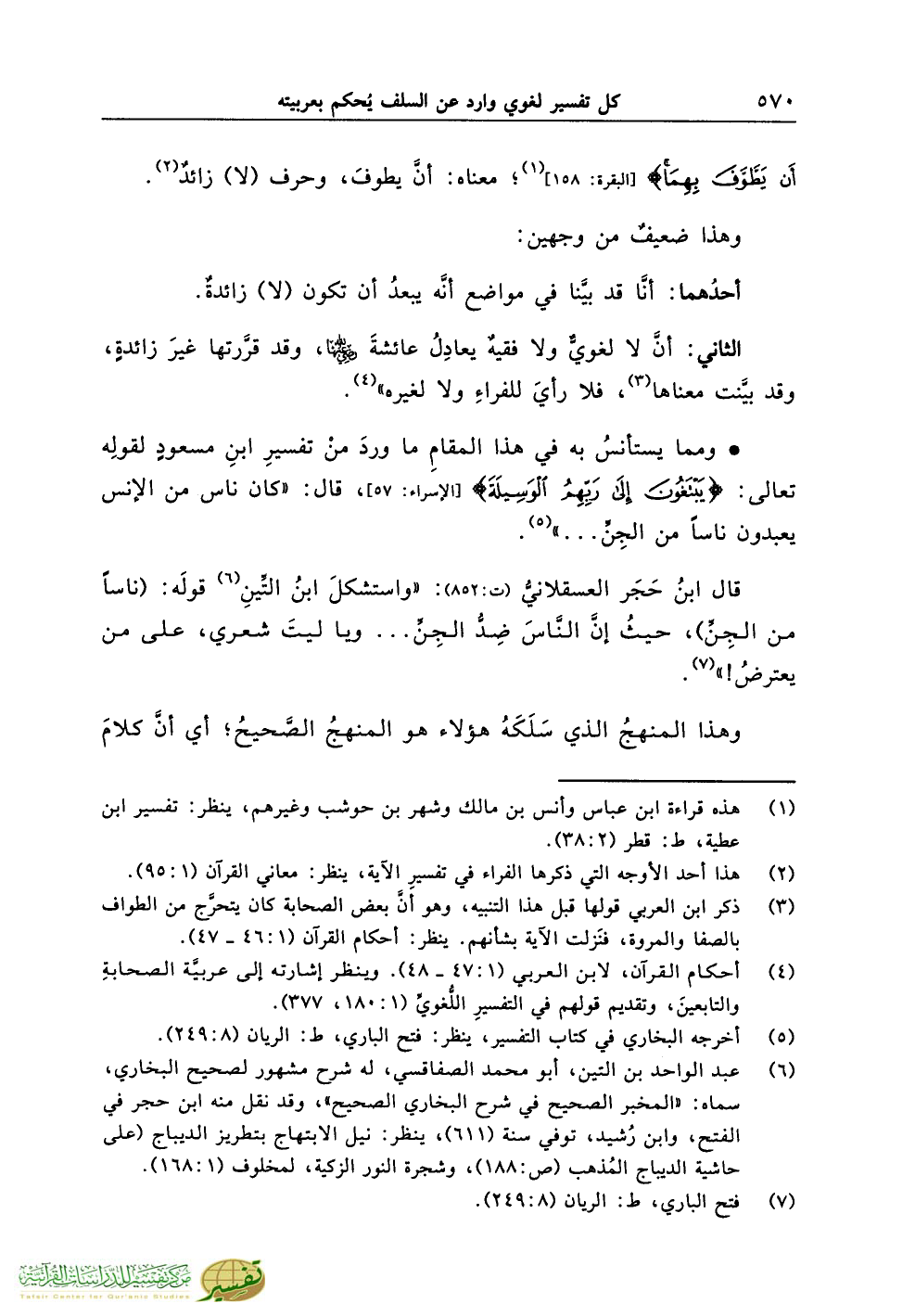 (¬3) ذكر ابن العربي قولها قبل هذا التنبيه، وهو أنَّ بعض الصحابة كان يتحرَّج من الطواف بالصفا والمروة، فنَزلت الآية بشأنهم. ينظر: أحكام القرآن (1:46 - 47).