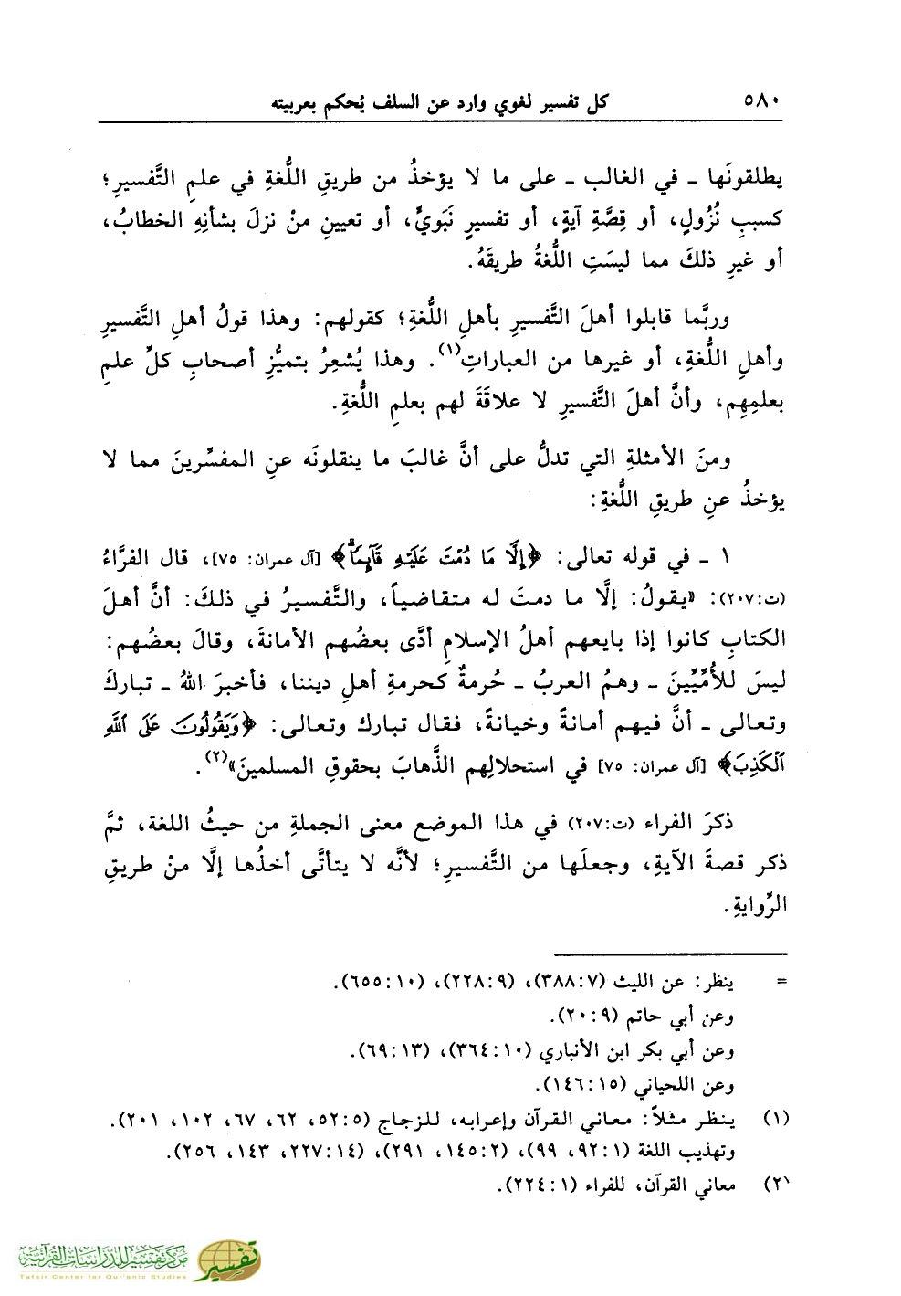 1 - في قوله تعالى: {إِلاَّ مَا دُمْتَ عَلَيْهِ قَائِمًا} [آل عمران: 75]، قال الفرَّاءُ (ت:207): «يقولُ: إلاَّ ما دمتَ له متقاضياً، والتَّفسيرُ في ذلكَ: أنَّ أهلَ الكتابِ كانوا إذا بايعهم أهلُ الإسلامِ أدَّى بعضُهم الأمانةَ، وقالَ بعضُهم: ليسَ للأُمِّيِّينَ ـ وهمُ العربُ ـ حُرمةٌ كحرمةِ أهلِ ديننا، فأخبرَ اللهُ ـ تباركَ وتعالى ـ أنَّ فيهم أمانةً وخيانةً، فقال تبارك وتعالى: {وَيَقُولُونَ عَلَى اللَّهِ الْكَذِبَ} [آل عمران: 75] في استحلالِهم الذَّهابَ بحقوقِ المسلمينَ» (¬2).