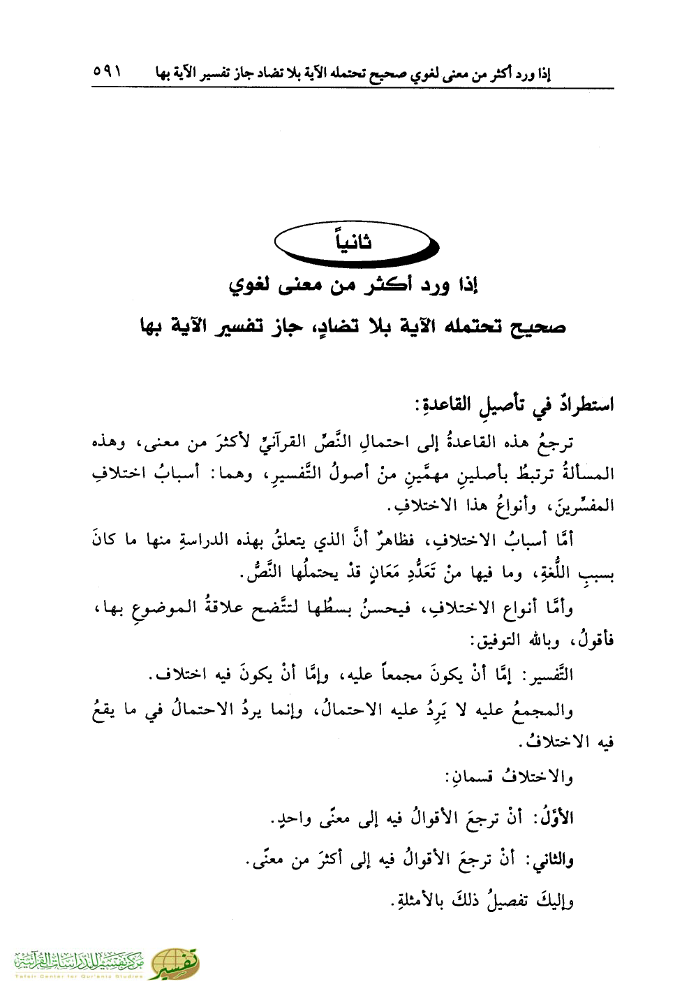 ترجعُ هذه القاعدةُ إلى احتمالِ النَّصِّ القرآنيِّ لأكثرَ من معنى، وهذه المسألةُ ترتبطُ بأصلينِ مهمَّينِ منْ أصولُ التَّفسيرِ، وهما: أسبابُ اختلافِ المفسِّرينَ، وأنواعُ هذا الاختلافِ.
