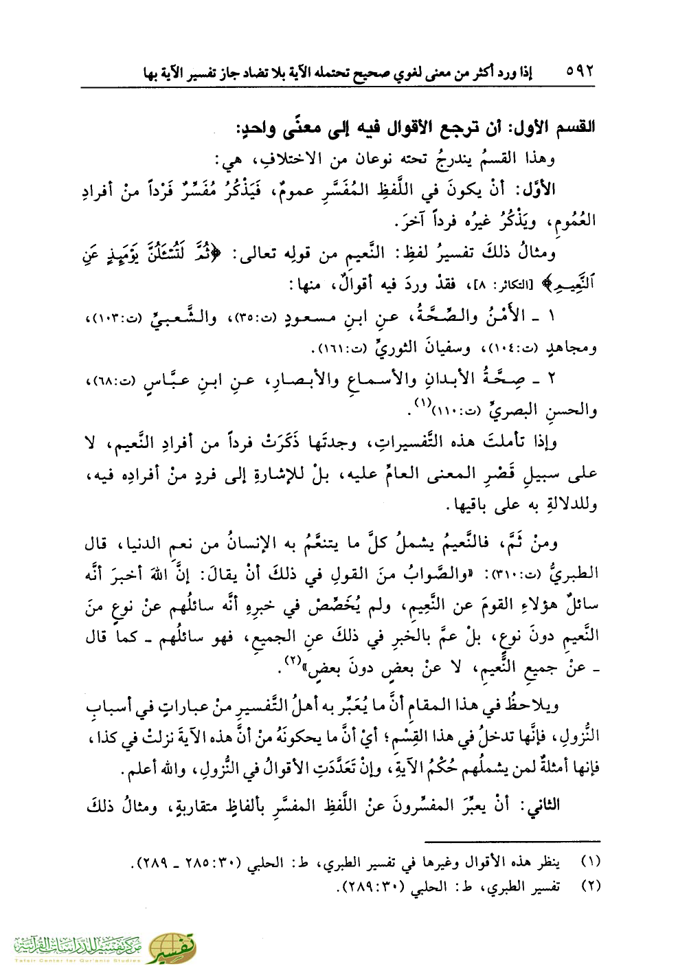 ومثالُ ذلكَ تفسيرُ لفظِ: النَّعيمِ من قولِه تعالى: {ثُمَّ لَتُسْأَلُنَّ يَوْمَئِذٍ عَنِ النَّعِيمِ} [التكاثر: 8]، فقدْ وردَ فيه أقوالٌ، منها: