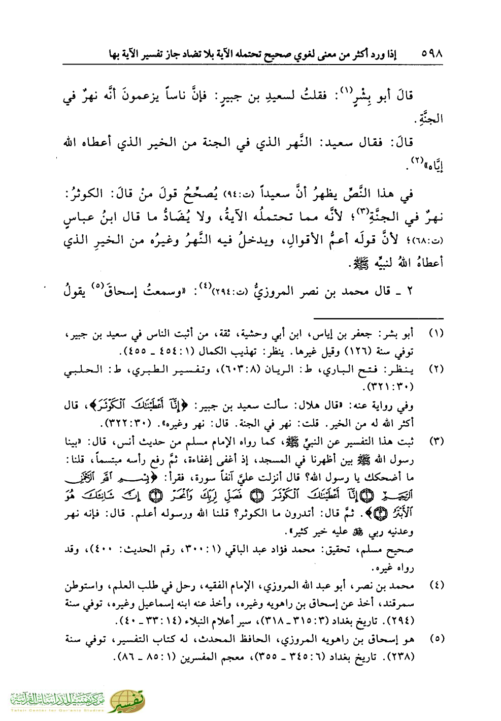 في هذا النَّصِّ يظهرُ أنَّ سعيداً (ت:94) يُصحِّحُ قولَ منْ قالَ: الكوثرُ: نهرٌ في الجنَّةِ (¬3)؛ لأنَّه مما تحتملُه الآيةُ، ولا يُضَادُّ ما قال ابنُ عباسٍ (ت:68)؛ لأنَّ قولَه أعمُّ الأقوالِ، ويدخلُ فيه النَّهرُ وغيرُه من الخيرِ الذي أعطاهُ اللهُ لنبيِّه صلّى الله عليه وسلّم.