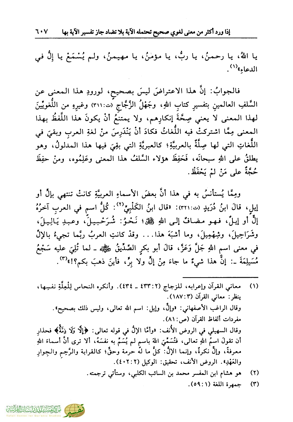 ومِمَّا يُستأنسُ به في هذا أنَّ بعضَ الأسماءِ العربيَّةِ كانتْ تنتهي بإلٍّ أو إيلٍ، قالَ ابنُ دُرَيدٍ (ت:321): «قال ابنُ الكَلْبِيِّ (¬2): كُلُّ اسمٍ في العربِ آخرُهُ إلٌّ أو إيلٌ، فهو مضافٌ إلى اللهِ عزّ وجل؛ نَحْوُ: شُرَحْبيلَ، وعبدِ يَالِيلَ، وشَرَاحِيلَ، وشِهْمِيلَ، وما أشبَهَ هذا ... وقدْ كانتِ العربُ ربَّما تجيءُ بالإلِّ في معنى اسمِ اللهِ جَلَّ وَعَزَّ، قالَ أبو بكرٍ الصِّدِّيقُ رضي الله عنه ـ لما تُلِيَ عليه سَجْعُ مُسَيلِمَةَ ـ: إنَّ هذا شيءٌ ما جاءَ مِنْ إلٍّ ولا بِرٍّ، فأينَ ذهبَ بكم؟!» (¬3).