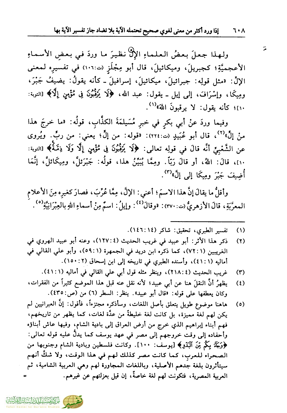 ولهذا جعلَ بعضُ العلماءِ الإِلَّ نظيرَ ما وردَ في بعضِ الأسماءِ الأعجميَّةِ؛ كجبريلَ، وميكائيلَ، قال أبو مِجْلَزٍ (ت:106) في تفسيرِه لمعنى الإلِّ: «مثل قولِه: جبرائيلَ، ميكائيلَ، إسرافيلَ ـ كأنه يقولُ: يضيفُ جَبْرَ، ومِيكَا، وإسْرَافَ، إلى إيل ـ يقول: عبد الله، {لاَ يَرْقُبُونَ فِي مُؤْمِنٍ إِلاًّ} [التوبة: 10]؛ كأنه يقول: لا يرقبونَ اللهَ» (¬1).
