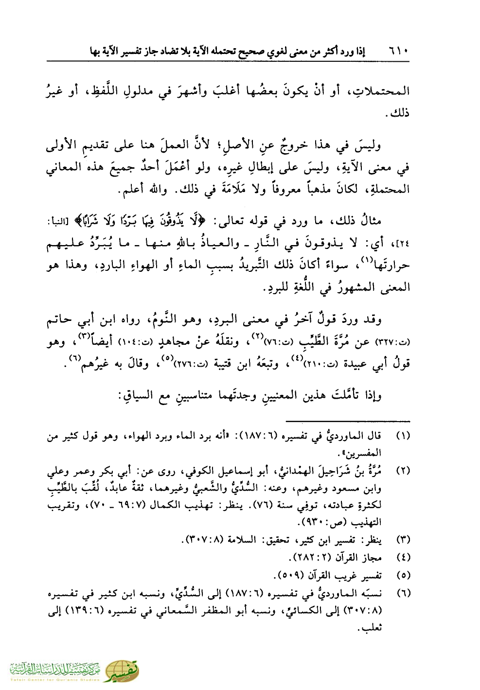 (¬1) قال الماورديُّ في تفسيره (6:187): «أنه برد الماء وبرد الهواء، وهو قول كثير من المفسرين».