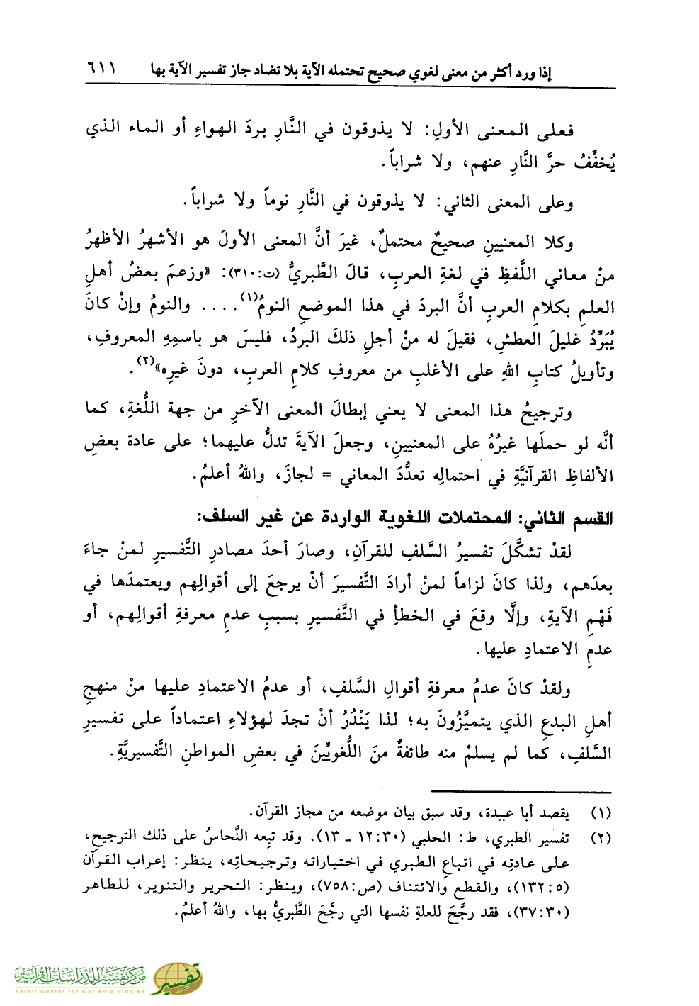 وكلا المعنيينِ صحيحٌ محتملٌ، غيرَ أنَّ المعنى الأولَ هو الأشهرُ الأظهرُ منْ معاني اللَّفظِ في لغةِ العربِ، قالَ الطَّبريُّ (ت:310): «وزعمَ بعضُ أهلِ العلمِ بكلامِ العربِ أنَّ البردَ في هذا الموضعِ النومُ (¬1) .... والنومُ وإنْ كانَ يُبَرِّدُ غليلَ العطشِ، فقيلَ له منْ أجلِ ذلكَ البردُ، فليسَ هو باسمِهِ المعروفِ، وتأويلُ كتابِ اللهِ على الأغلبِ من معروفِ كلامِ العربِ، دونَ غيرِه» (¬2).