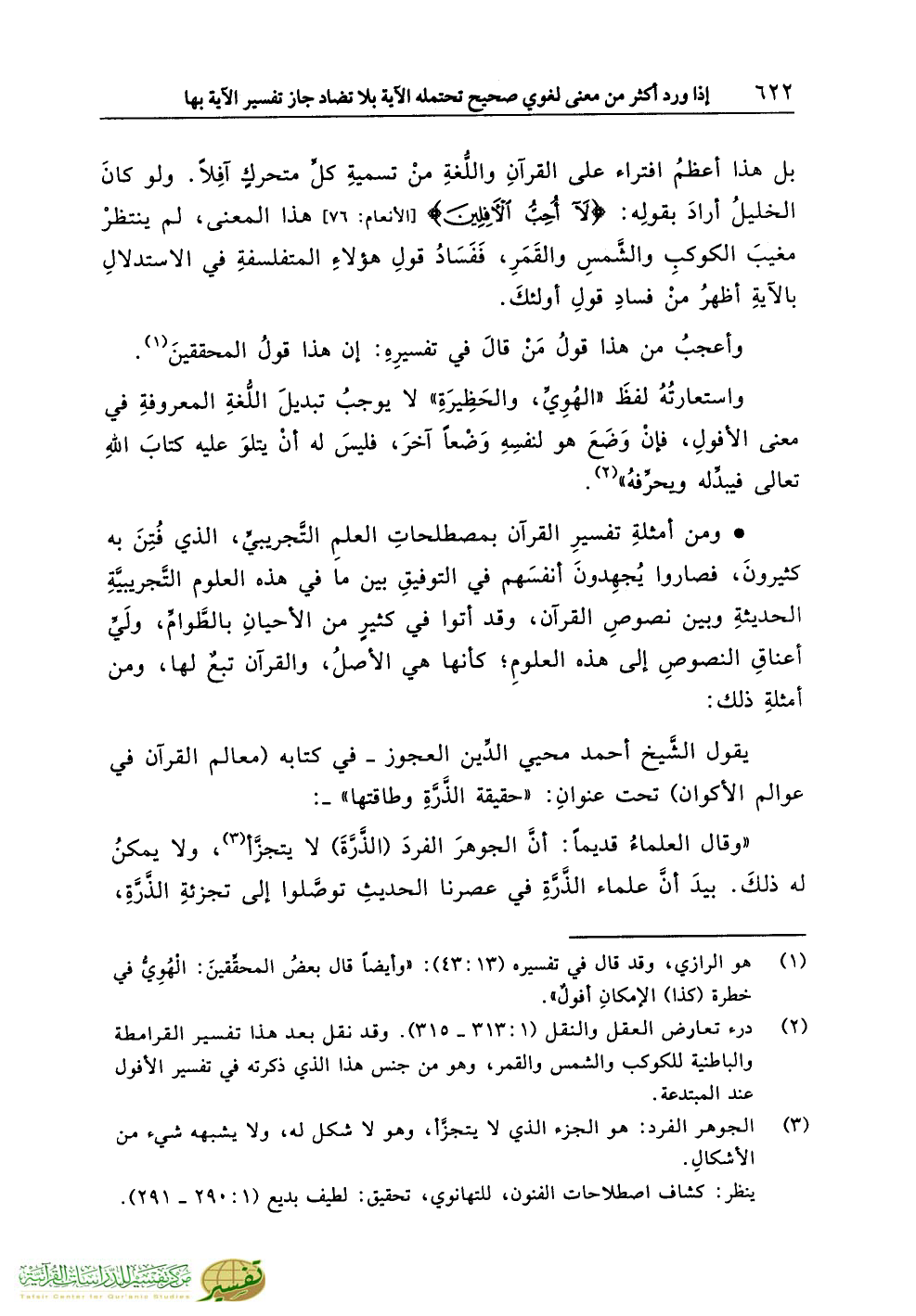 (¬1) هو الرازي، وقد قال في تفسيره (13:43): «وأيضاً قال بعضُ المحقِّقينَ: الْهُوِيُّ في خطرة (كذا) الإمكانِ أفولٌ».