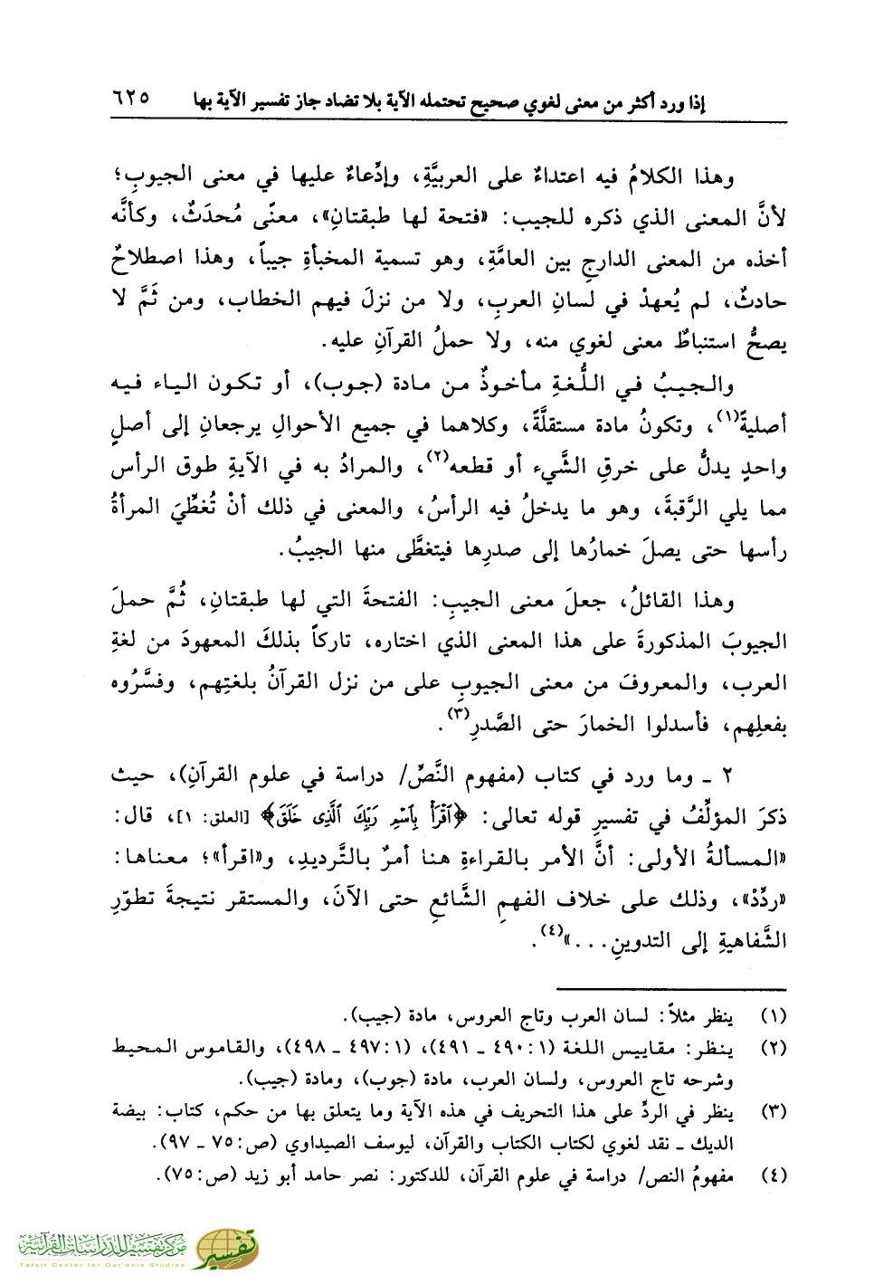 وهذا الكلامُ فيه اعتداءٌ على العربيَّةِ، وإدِّعاءٌ عليها في معنى الجيوبِ؛ لأنَّ المعنى الذي ذكره للجيب: «فتحة لها طبقتانِ»، معنًى مُحدَثٌ، وكأنَّه أخذه من المعنى الدارجِ بين العامَّةِ، وهو تسمية المخبأةِ جيباً، وهذا اصطلاحٌ حادثٌ، لم يُعهدْ في لسانِ العربِ، ولا من نزلَ فيهم الخطاب، ومن ثَمَّ لا يصحُّ استنباطٌ معنى لغوي منه، ولا حملُ القرآنِ عليه.