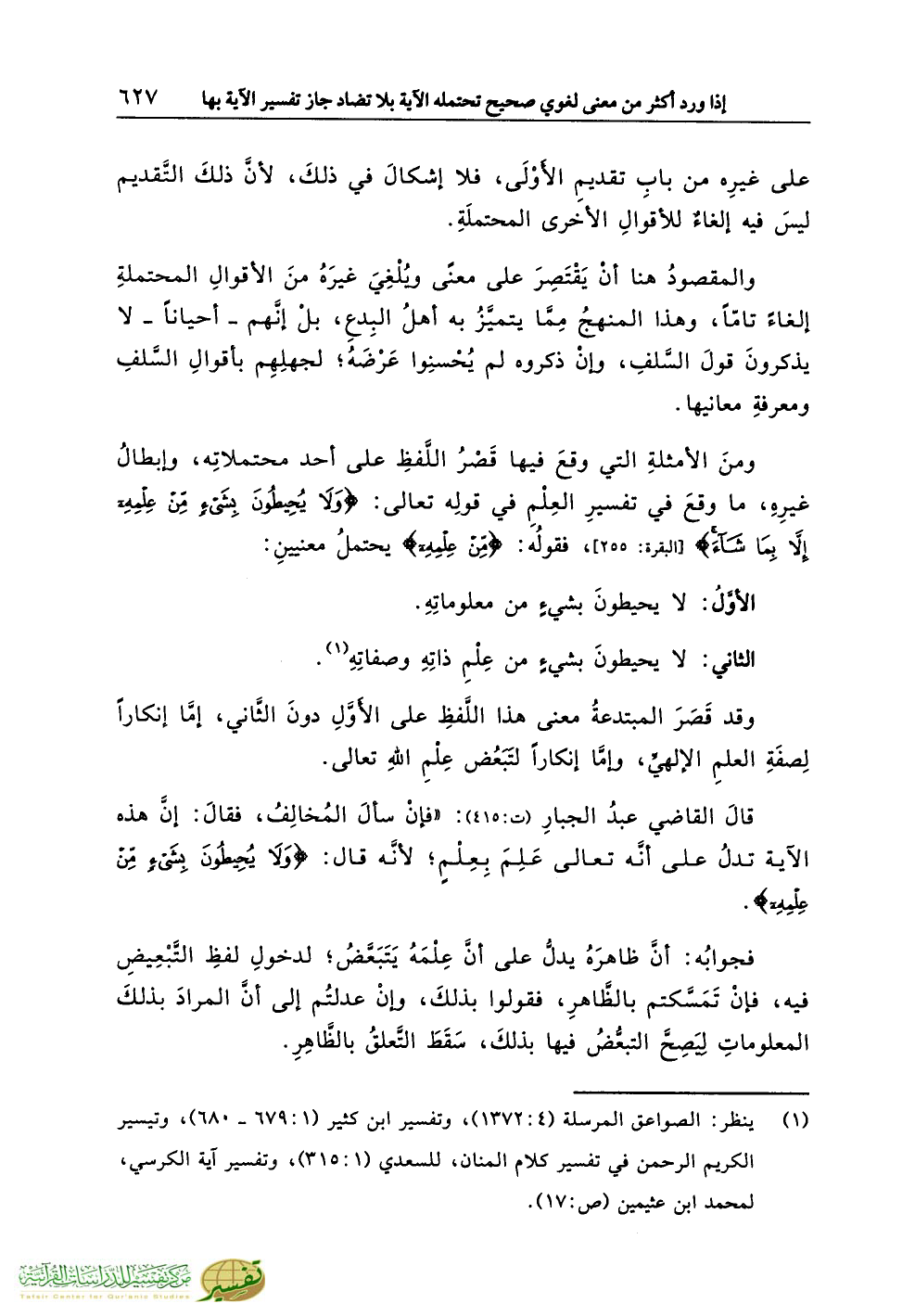 ومنَ الأمثلةِ التي وقعَ فيها قَصْرُ اللَّفظِ على أحد محتملاتِه، وإبطالُ غيرِهِ، ما وقعَ في تفسيرِ العِلْمِ في قولِه تعالى: {وَلاَ يُحِيطُونَ بِشَيءٍ مِنْ عِلْمِهِ إِلاَّ بِمَا شَاءَ} [البقرة: 255]، فقولُه: {مِنْ عِلْمِهِ} يحتملُ معنيينِ: