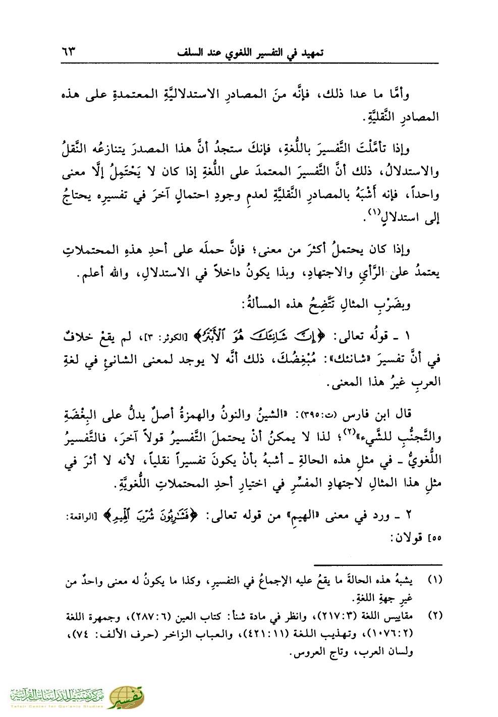 قال ابن فارس (ت:395): «الشينُ والنونُ والهمزةُ أصلٌ يدلُّ على البِغْضَةِ والتَّجنُّبِ للشَّيء» (¬2)؛ لذا لا يمكنُ أنْ يحتملَ التَّفسيرُ قولاً آخرَ، فالتَّفسيرُ اللُّغويُّ ـ في مثلِ هذه الحالةِ ـ أشبهُ بأنْ يكونَ تفسيراً نقلياً، لأنه لا أثرَ في مثلِ هذا المثالِ لاجتهادِ المفسِّرِ في اختيارِ أحدِ المحتملاتِ اللُّغويَّةِ.