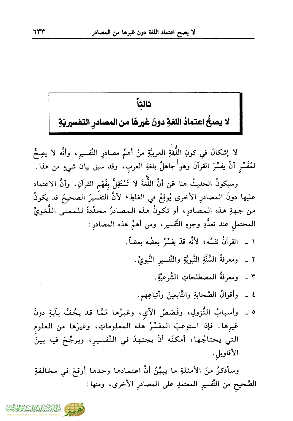 ثالثاً لا يصحُّ اعتمادُ اللغةِ دونَ غيرهَا من المصادرِ التفسيريَةِ