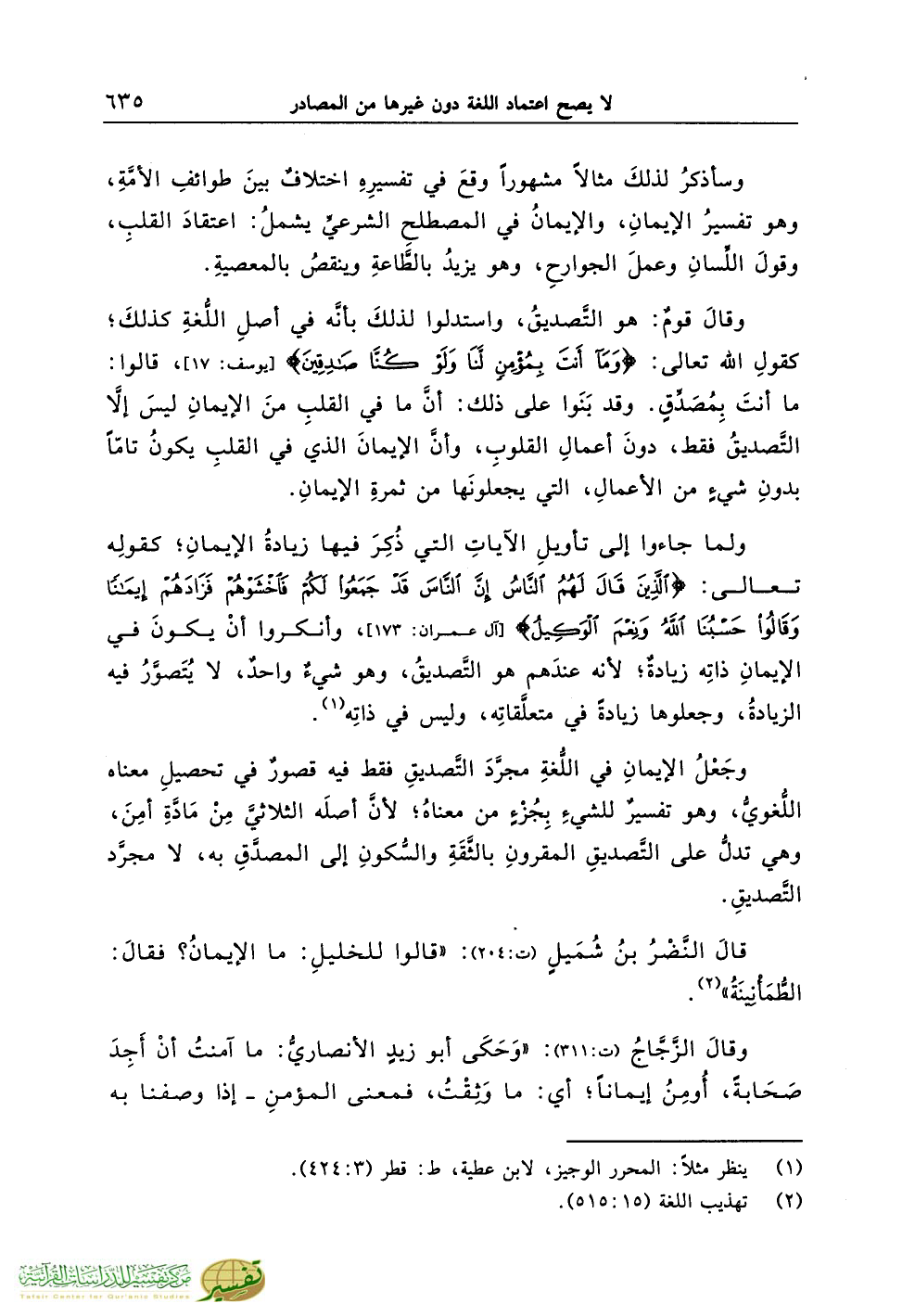 قالَ النَّضْرُ بنُ شُمَيلٍ (ت:204): «قالوا للخليلِ: ما الإيمانُ؟ فقالَ: الطُّمَانِينَةُ» (¬2).