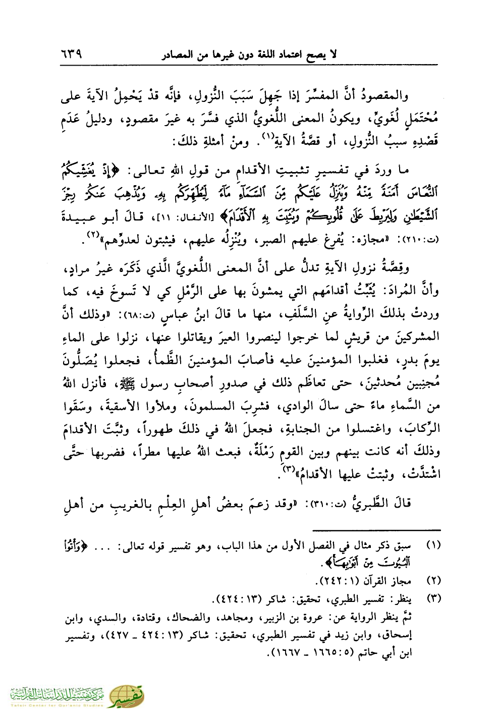 وقِصَّةُ نزولِ الآيةِ تدلُّ على أنَّ المعنى اللُّغويَّ الَّذي ذَكَرَه غيرُ مرادٍ، وأنَّ المُرادَ: يُثَبِّتُ أقدامَهم التي يمشونَ بها على الرَّمْلِ كي لا تَسوخَ فيه، كما وردتْ بذلكَ الرِّوايةُ عنِ السَّلَفِ، منها ما قالَ ابنُ عباسٍ (ت:68): «وذلك أنَّ المشركينَ من قريشٍ لما خرجوا لينصروا العيرَ ويقاتلوا عنها، نزلوا على الماءِ يومَ بدرٍ، فغلبوا المؤمنينَ عليه فأصابَ المؤمنينَ الظَّمأُ، فجعلوا يُصَلُّونَ مُجنِبين مُحدثينَ، حتى تعاظَم ذلك في صدورِ أصحابِ رسول صلّى الله عليه وسلّم، فأنزل اللهُ من السَّماءِ ماءً حتى سالَ الوادي، فشرِبَ المسلمونَ، وملأوا الأسقيةَ، وسَقَوا الرِّكابَ، واغتسلوا من الجنابةِ، فجعلَ اللهُ في ذلكَ طهوراً، وثبَّتَ الأقدامَ وذلكَ أنه كانت بينهم وبين القومِ رَمْلَةٌ، فبعث اللهُ عليها مطراً، فضربها حتَّى اشْتدَّتْ، وثبتتْ عليها الأقدامُ» (¬3).