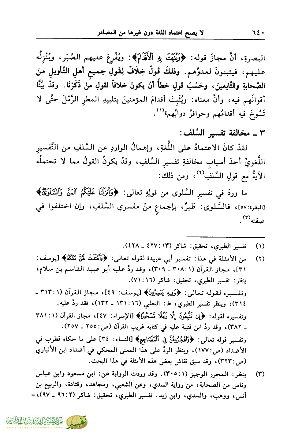 ما وردَ في تفسيرِ السَّلوى من قولِهِ تعالى: {وَأَنْزَلْنَا عَلَيْكُمُ الْمَنَّ وَالسَّلْوَى} [البقرة:57]، فالسَّلوى: طَيرٌ، بإجماعٍ منْ مفسري السَّلفِ، وإن اختلفوا في صفته (¬3).