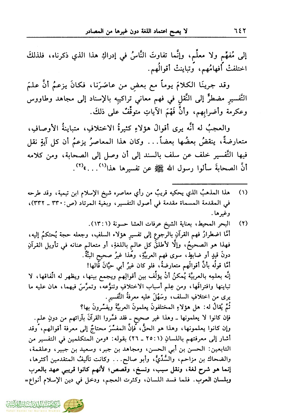 أمَّا اضطرارُ فهم القرآنِ بالرجوعِ إلى تفسيرِ هؤلاء السلفِ، وجعله حجة يُحتكمُ إليه، فهذا هو الصحيحُ، وإلاَّ لأطلقَ كل عالمٍ باللغةِ، أو متعالمٍ عنانه في تأويل القرآنِ دونَ قيدٍ أو ضابطٍ، سوى فهم العربيَّةِ، وهذا غيرُ صحيحٍ البتَّةَ.