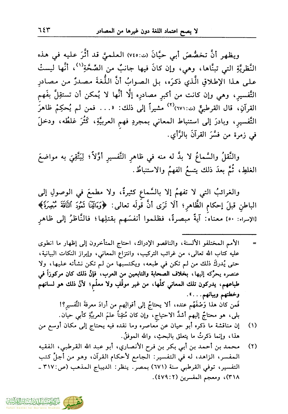 ويظهر أنَّ تخصُّصَ أبي حيَّانَ (ت:745) العلميَّ قد أثَّرَ عليه في هذه النَّظريَّةِ التي تبنَّاها، وهي، وإن كانَ فيها جانبٌ من الصِّحَّةِ (¬1)، أنَّها ليستْ على هذا الإطلاقِ الَّذي ذكرَه، بل الصوابُ أنَّ اللُّغةَ مصدرٌ من مصادرِ التَّفسيرِ، وهي وإن كانت من أكبرِ مصادرِه إلاَّ أنَّها لا يُمكن أن تستقِلَّ بفَهمِ القرآنِ، قال القرطبيٌّ (ت:671) (¬2) مشيراً إلى ذلك: «... فمن لم يُحكِمْ ظاهرَ التَّفسيرِ، وبادرَ إلى استنباط المعاني بمجردِ فهمِ العربيَّةِ، كَثُرَ غلطُه، ودخلَ في زمرة من فسَّرَ القرآنَ بالرَّأي.
