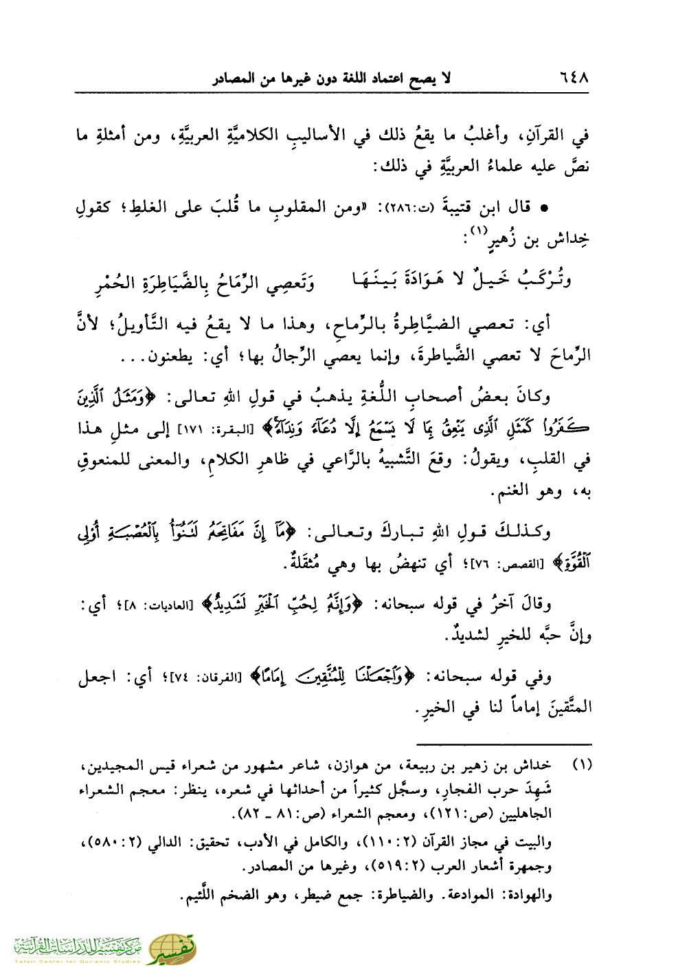 * قال ابن قتيبةَ (ت:286): «ومن المقلوبِ ما قُلبَ على الغلطِ؛ كقولِ خِداش بن زُهيرٍ (¬1):
