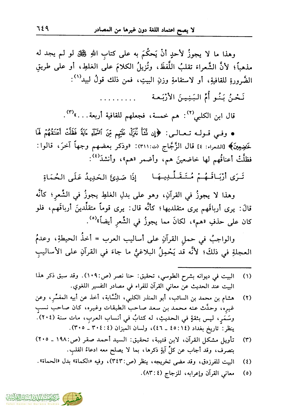(¬1) البيت في ديوانه بشرح الطوسي، تحقيق: حنا نصر (ص:109). وقد سبق ذكر هذا البيت عند الحديث عن معاني القرآن للفراء في مصادر التفسير اللغوي.