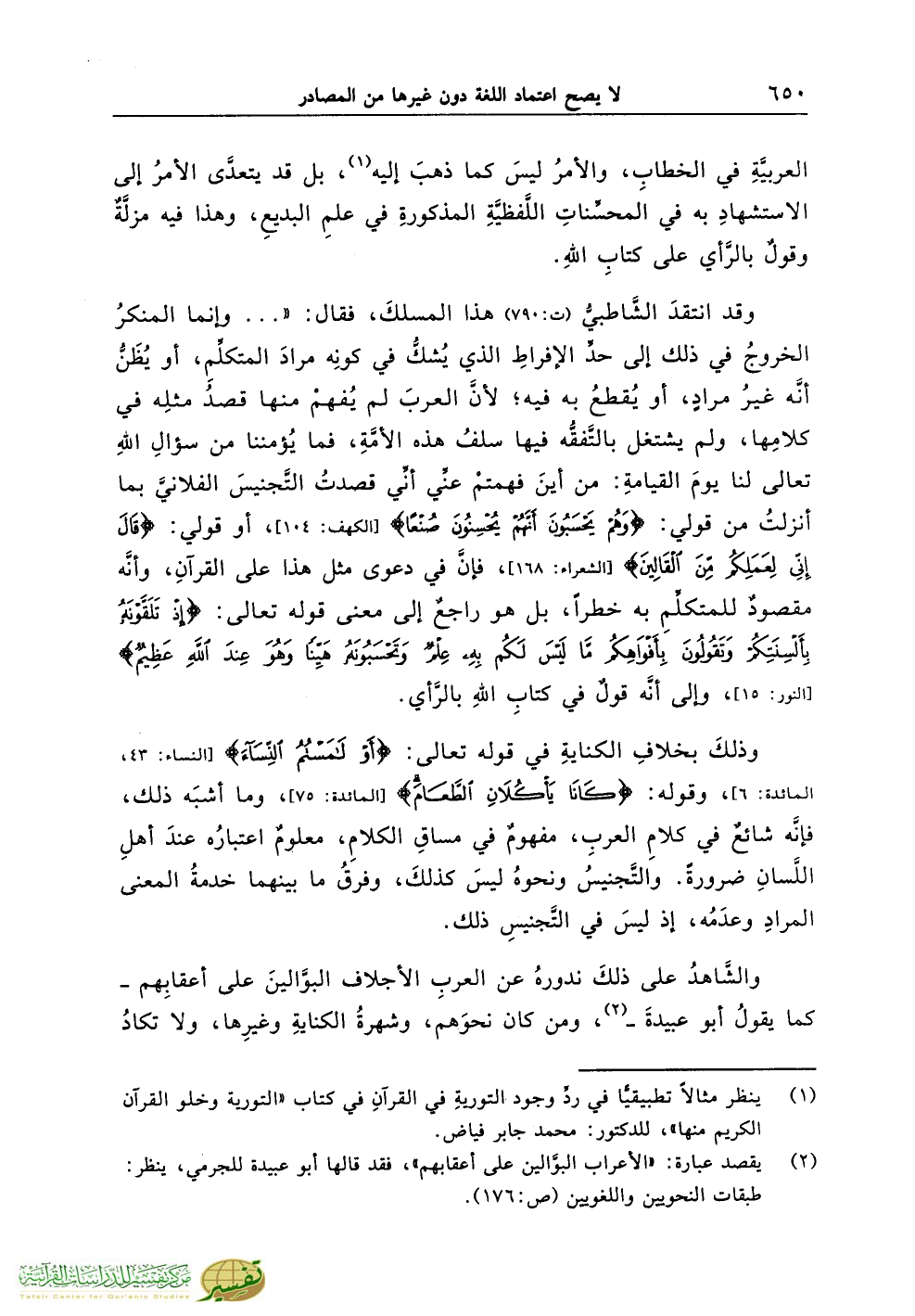 (¬1) ينظر مثالاً تطبيقيًّا في ردِّ وجود التوريةِ في القرآنِ في كتاب «التورية وخلو القرآن الكريم منها»، للدكتور: محمد جابر فياض.