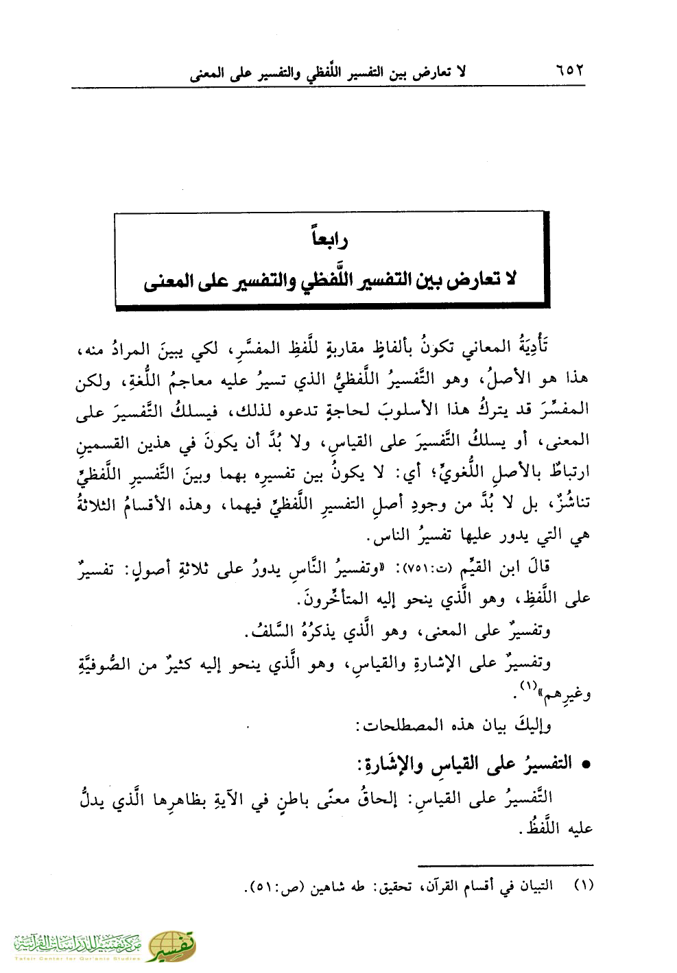 قالَ ابن القيِّم (ت:751): «وتفسيرُ النَّاسِ يدورُ على ثلاثةِ أصولٍ: تفسيرٌ على اللَّفظِ، وهو الَّذي ينحو إليه المتأخِّرونَ.