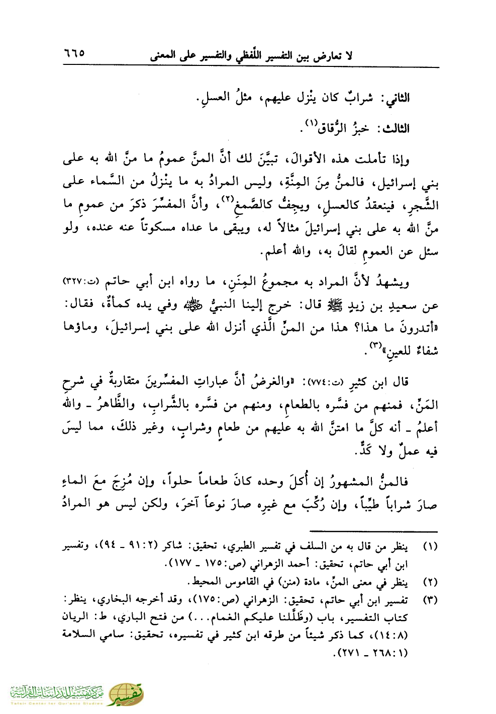 وإذا تأملت هذه الأقوالَ، تبيَّنَ لك أنَّ المنَّ عمومُ ما منَّ الله به على بني إسرائيل، فالمنُّ مِنَ المِنَّةِ، وليس المرادُ به ما ينْزلُ من السَّماء على الشَّجرِ، فينعقدُ كالعسلِ، ويجِفُّ كالصَّمغِ (¬2)، وأنَّ المفسِّرَ ذكرَ من عمومِ ما منَّ الله به على بني إسرائيلَ مثالاً له، ويبقى ما عداه مسكوتاً عنه عنده، ولو سئل عن العمومِ لقالَ به، والله أعلم.