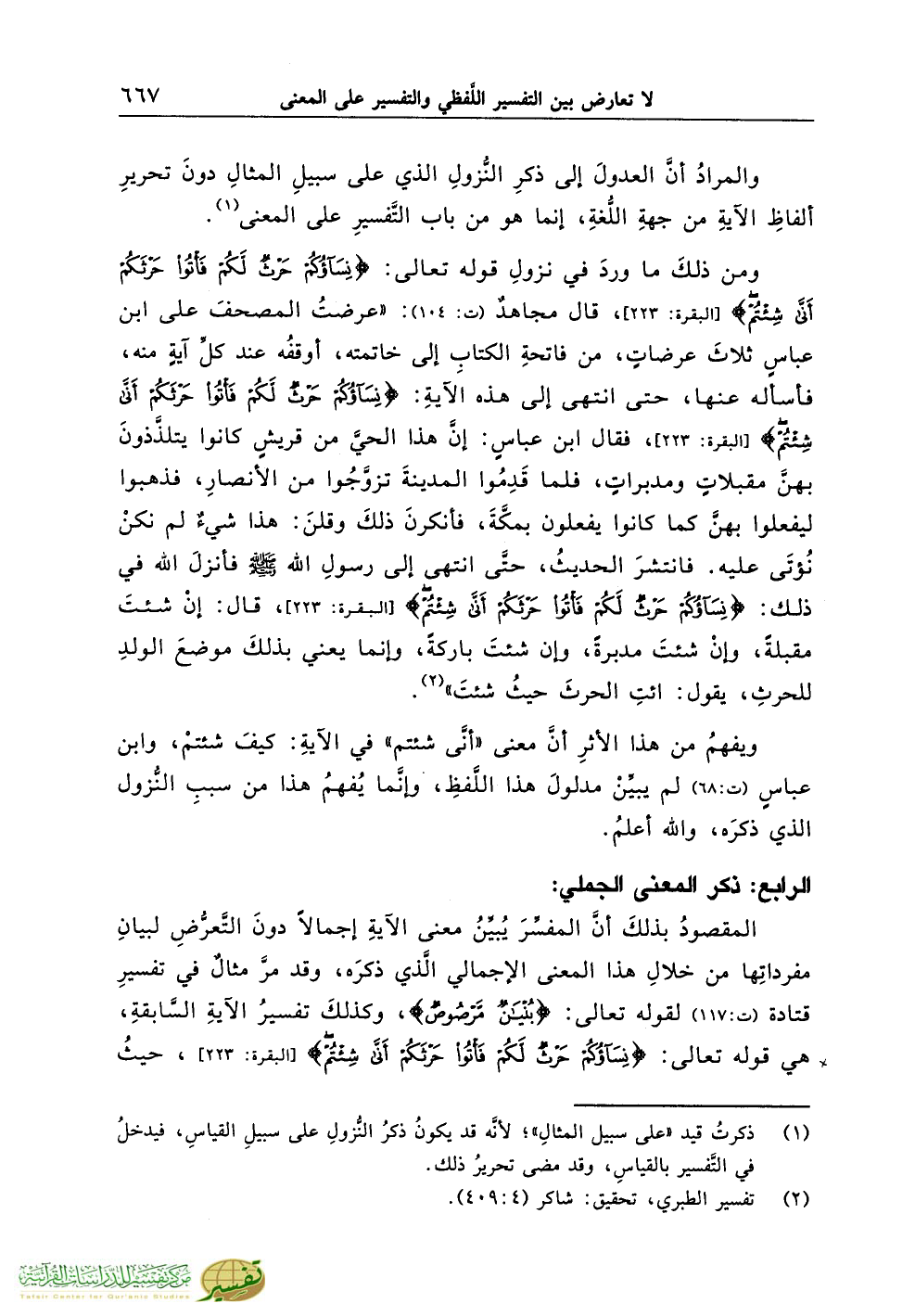 المقصودُ بذلكَ أنَّ المفسِّرَ يُبيِّنُ معنى الآيةِ إجمالاً دونَ التَّعرُّضِ لبيانِ مفرداتِها من خلالِ هذا المعنى الإجمالي الَّذي ذكرَه، وقد مرَّ مثالٌ في تفسيرِ قتادة (ت:117) لقوله تعالى: {بُنْيَانٌ مَرْصُوصٌ}، وكذلكَ تفسيرُ الآيةِ السَّابقةِ، هي قوله تعالى: {نِسَاؤُكُمْ حَرْثٌ لَكُمْ فَاتُوا حَرْثَكُمْ أَنَّى شِئْتُمْ} [البقرة: 223]، حيثُ