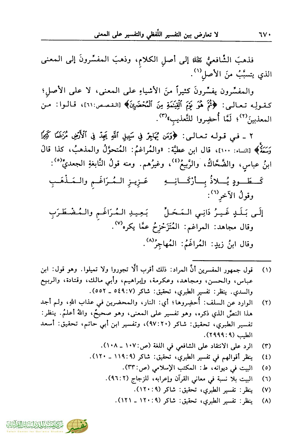 فذهبَ الشِّافعيُّ رحمه الله إلى أصلِ الكلامِ، وذهبَ المفسِّرونَ إلى المعنى الذي يتسبَّبُ منَ الأصلِ (¬1).