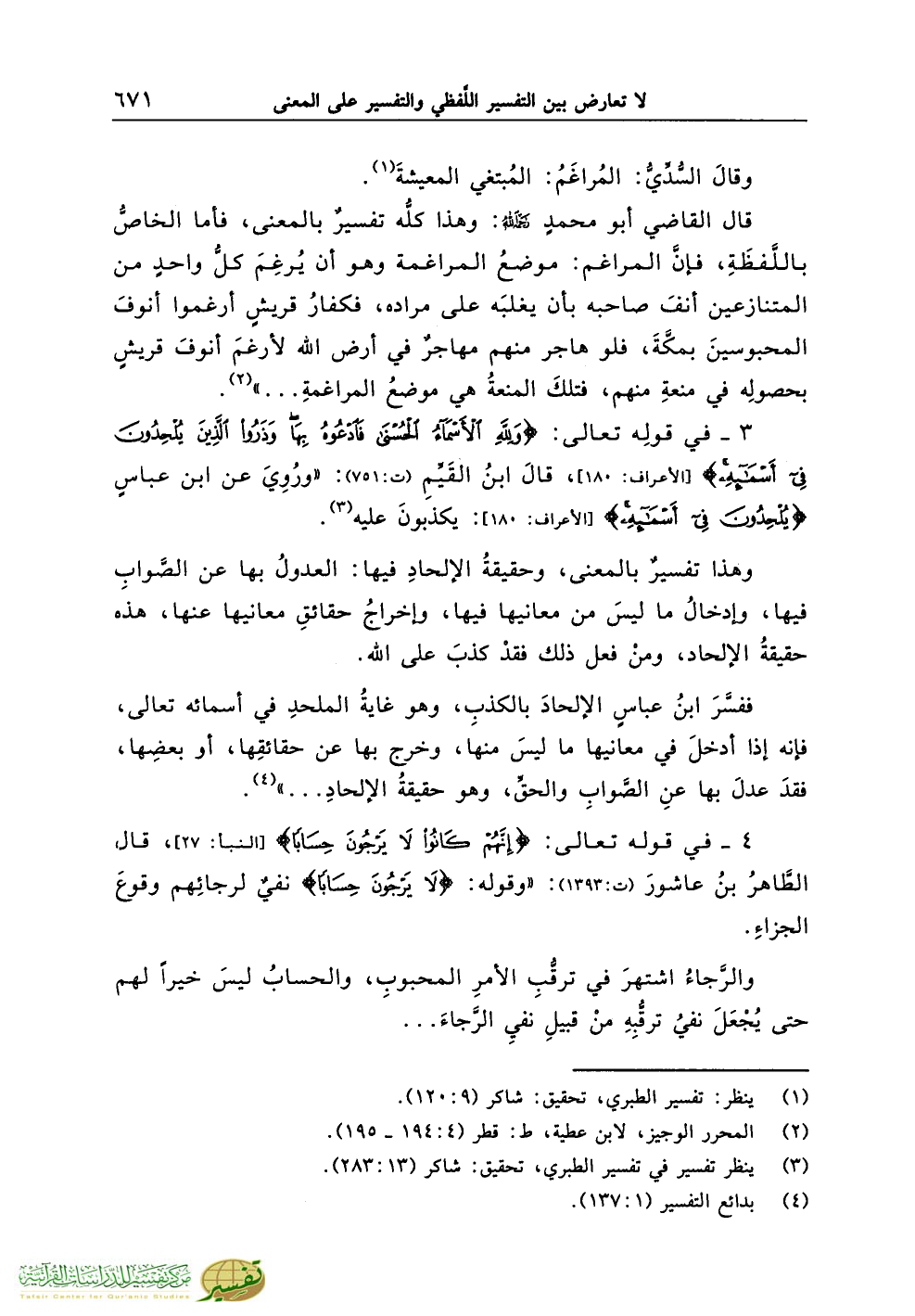 3 - في قولِه تعالى: {وَلِلَّهِ الأَسْمَاءُ الْحُسْنَى فَادْعُوهُ بِهَا وَذَرُوا الَّذِينَ يُلْحِدُونَ فِي أَسْمَائِهِ} [الأعراف: 180]، قالَ ابنُ القَيِّمِ (ت:751): «ورُوِيَ عن ابن عباسٍ {يُلْحِدُونَ فِي أَسْمَائِهِ} [الأعراف: 180]: يكذبونَ عليه (¬3).