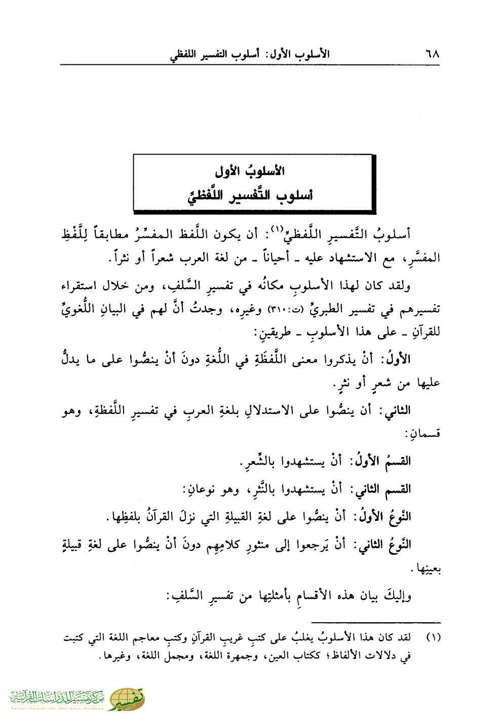 (¬1) لقد كان هذا الأسلوبُ يغلبُ على كتبِ غريبِ القرآنِ وكتبِ معاجم اللغة التي كتبت في دلالات الألفاظ؛ ككتاب العين، وجمهرة اللغة، ومجمل اللغة، وغيرها.