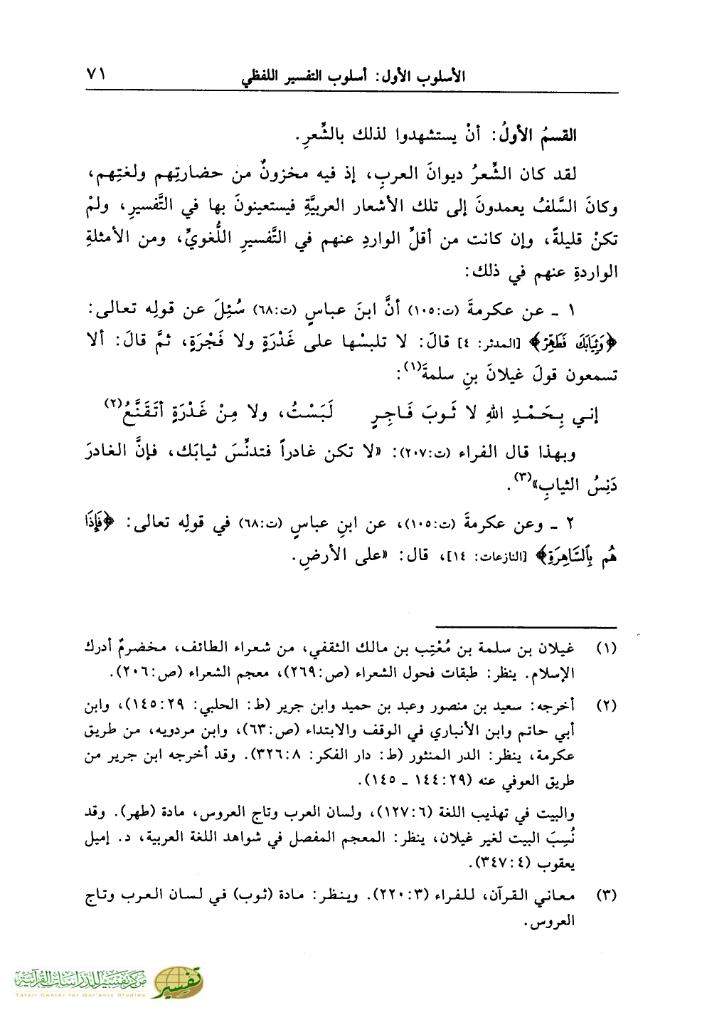 1 - عن عكرمةَ (ت:105) أنَّ ابنَ عباسٍ (ت:68) سُئِلَ عن قولِه تعالى: {وَثِيَابَكَ فَطَهِّرْ} [المدثر: 4] قالَ: لا تلبسْها على غَدْرَةٍ ولا فَجْرَةٍ، ثمَّ قالَ: ألا تسمعون قولَ غيلانَ بنِ سلمةَ (¬1):
