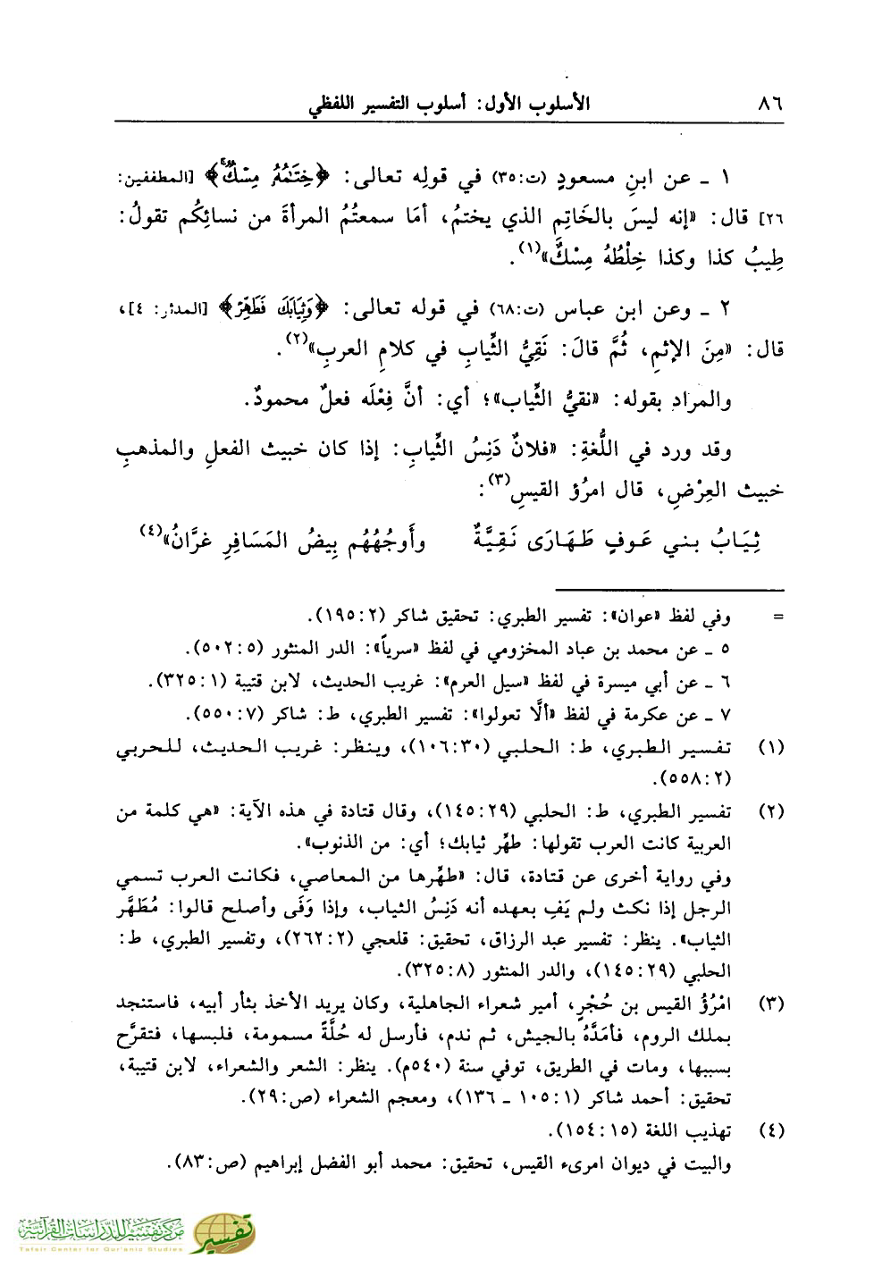 2 - وعن ابن عباس (ت:68) في قوله تعالى: {وَثِيَابَكَ فَطَهِّرْ} [المدثر: 4]، قال: «مِنَ الإثمِ، ثُمَّ قالَ: نَقِيُّ الثِّيابِ في كلامِ العربِ» (¬2).