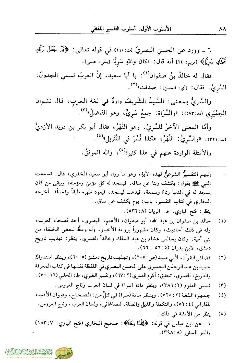 6 - وورد عن الحسنِ البصريِّ (ت:110) في قوله تعالى: {قَدْ جَعَلَ رَبُّكِ تَحْتَكِ سَرِيًّا} [مريم: 24] أنه قال: «كان واللهِ سَرِيًّا [يعني: عيسى].