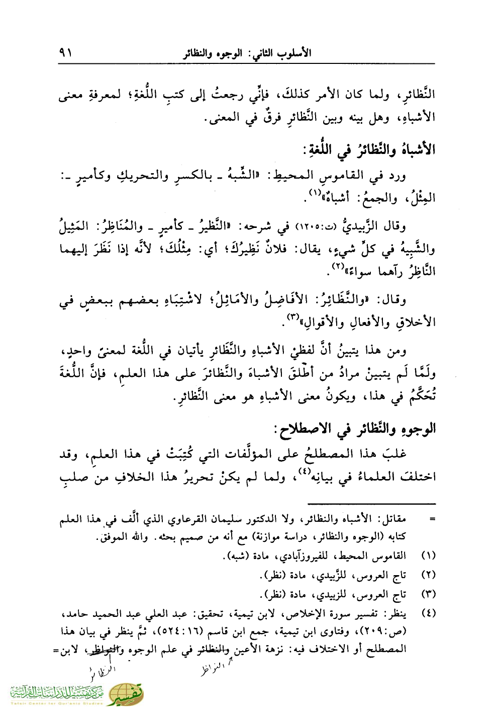 (¬4) ينظر: تفسير سورة الإخلاص، لابن تيمية، تحقيق: عبد العلي عبد الحميد حامد، (ص:209)، وفتاوى ابن تيمية، جمع ابن قاسم (16:524)، ثمَّ ينظر في بيان هذا المصطلح أو الاختلاف فيه: نزهة الأعين والنظائر في علم الوجوه والنواظر، لابن =