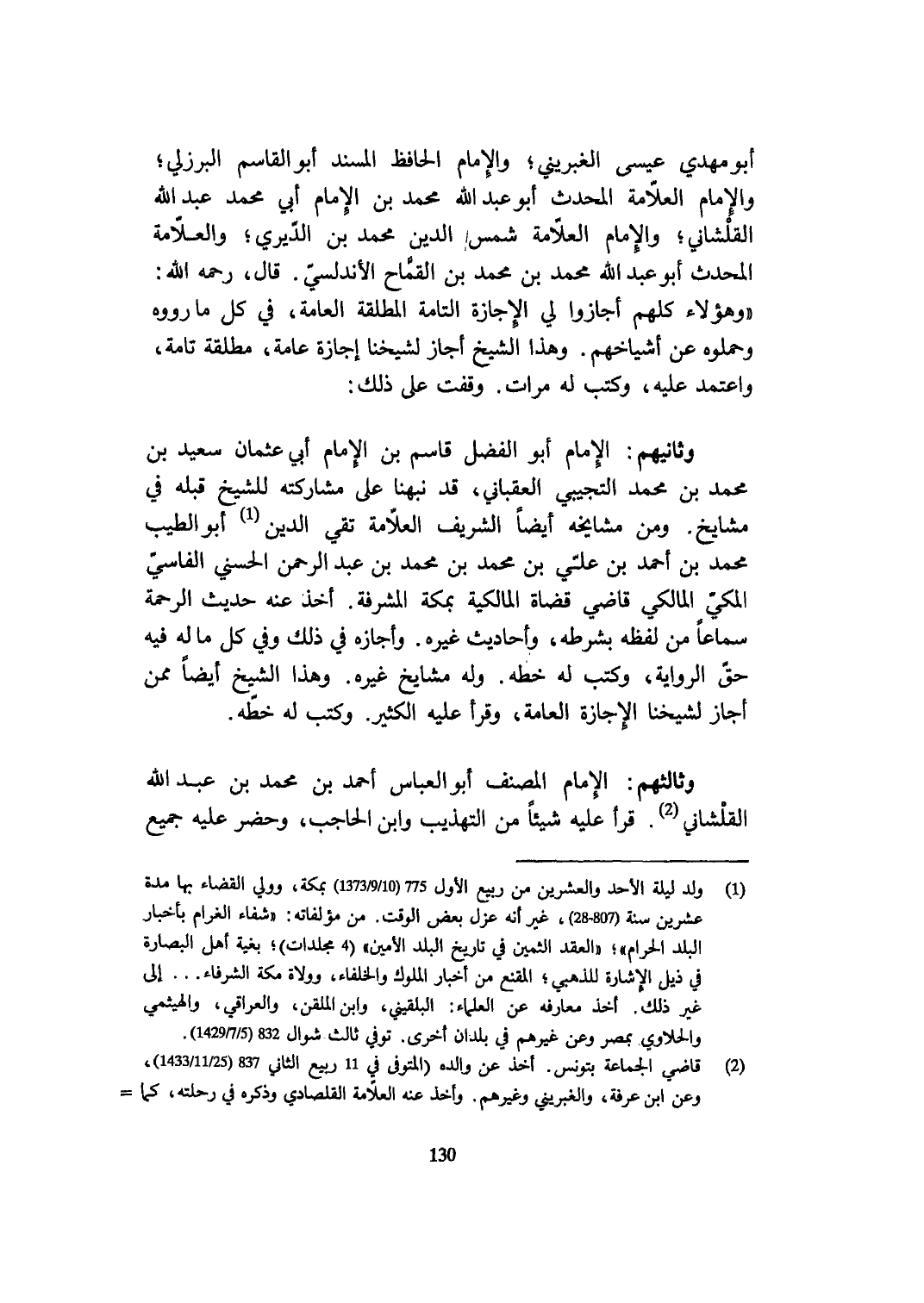 أَبُو مهْدي عِيسَى الغبريني وَالْإِمَام الْحَافِظ الْمسند أَبُو الْقَاسِم الْبُرْزُليّ وَالْإِمَام الْعَلامَة الْمُحدث أَبُو عبد الله مُحَمَّد بن الإِمَام أبي مُحَمَّد عبد الله القلشاني وَالْإِمَام الْعَلامَة شمس الدّين مُحَمَّد بن الديري والعلامة الْمُحدث أَبُو عبد الله مُحَمَّد بن مُحَمَّد بن القماح الأندلسي قَالَ رَحمَه الله وَهَؤُلَاء كلهم أَجَازُوا لي الْإِجَازَة التَّامَّة الْمُطلقَة الْعَامَّة فِي كل مَا رَوَوْهُ وَحَمَلُوهُ عَن أَشْيَاخهم وَهَذَا الشَّيْخ أجَاز لشَيْخِنَا إجَازَة عَامَّة مُطلقَة تَامَّة وَاعْتمد عَلَيْهِ وَكتب لَهُ مَرَّات وقفت على ذَلِك