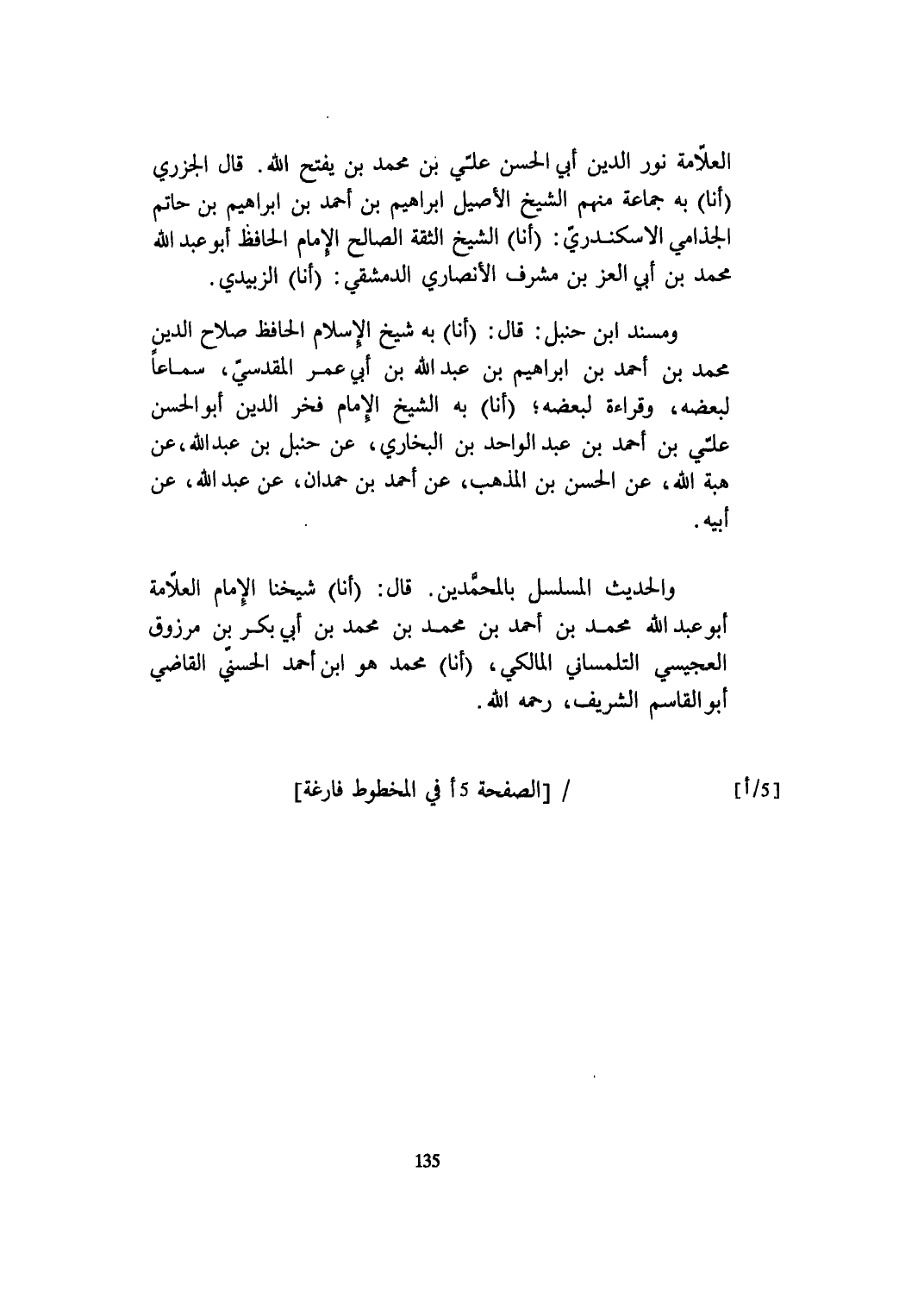 ومسند ابْن حَنْبَل قَالَ أَنا بِهِ شيخ الْإِسْلَام الْحَافِظ صَلَاح الدّين مُحَمَّد بن أَحْمد بن ابراهيم بن عبد الله بن أبي عمر الْمَقْدِسِي سَمَاعا لبعضه وَقِرَاءَة لبعضه أَنا بِهِ الشَّيْخ الإِمَام فَخر الدّين أَبُو الْحسن عَليّ بن أَحْمد بن عبد الْوَاحِد بن البُخَارِيّ عَن حَنْبَل بن عبد الله عَن هبة الله عَن الْحسن بن الْمَذْهَب عَن أَحْمد بن حمدَان عَن عبد الله عَن أَبِيه