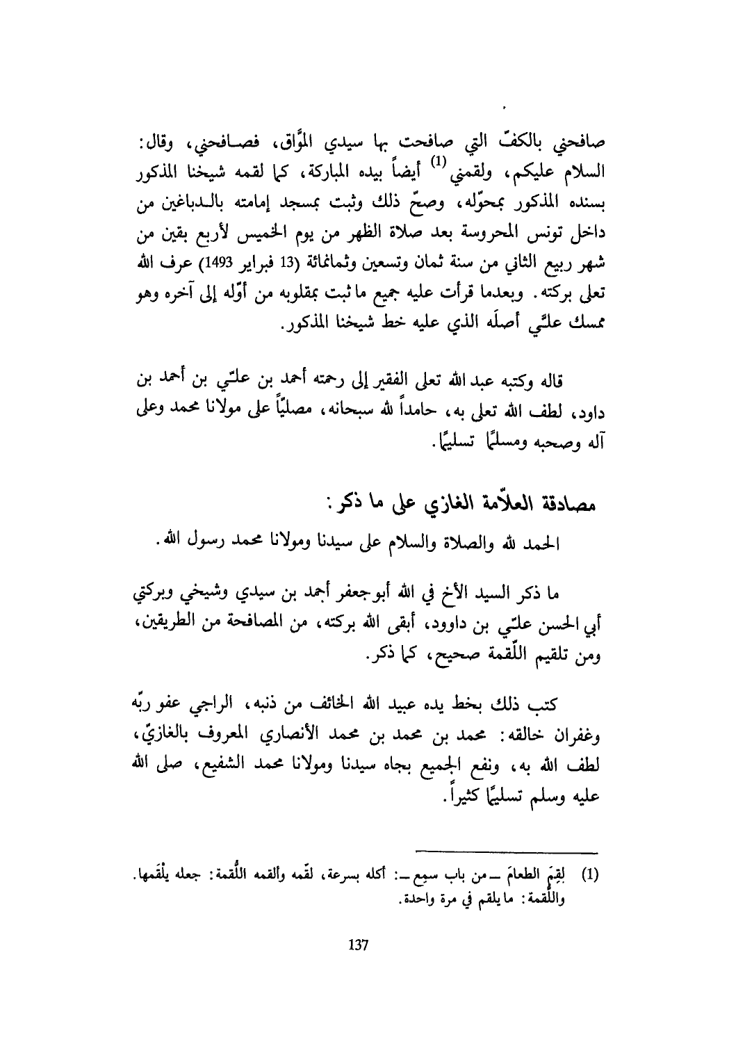 مَا ذكر السَّيِّد الْأَخ فِي الله أَبُو جَعْفَر أَحْمد بن سَيِّدي وشيخي وبركتي أبي الْحسن عَليّ بن دَاوُود أبقى الله بركته من المصافحة من الطَّرِيقَيْنِ وَمن تلقيم صَحِيح كَمَا ذكر