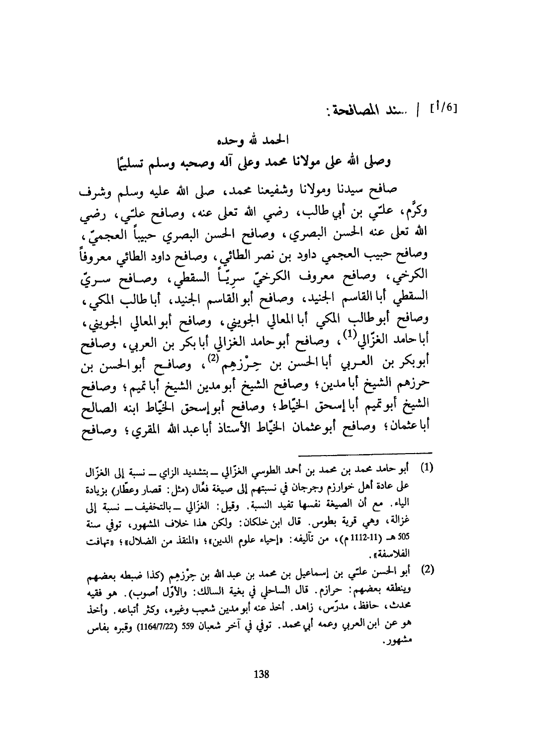 صَافح سيدنَا ومولانا وشفيعنا مُحَمَّد صلى الله عَلَيْهِ وَسلم وَشرف وكرم عَليّ بن أبي طَالب رَضِي الله تعلى عَنهُ وصافح عَليّ رَضِي الله تعلى عَنهُ الْحسن الْبَصْرِيّ وصافح الْحسن الْبَصْرِيّ حبيبا العجمي وصافح حبيب العجمي دَاوُد بن نصر الطَّائِي وصافح دَاوُد الطَّائِي مَعْرُوفا الْكَرْخِي وصافح مَعْرُوف الْكَرْخِي سريا السَّقطِي وصافح سري السَّقطِي أَبَا الْقَاسِم الْجُنَيْد وصافح أَبُو الْقَاسِم الْجُنَيْد أَبَا طَالب الْمَكِّيّ وصافح أَبُو طَالب الْمَكِّيّ أَبَا الْمَعَالِي الْجُوَيْنِيّ وصافح أَبُو الْمَعَالِي الْجُوَيْنِيّ أَبَا حَامِد الْغَزالِيّ وصافح أَبُو حَامِد الْغَزالِيّ أَبَا بكر بن الْعَرَبِيّ وصافح أَبُو بكر بن الْعَرَبِيّ أَبَا الْحسن بن حرزهم وصافح أَبُو الْحسن بن حرزهم الشَّيْخ أَبَا مَدين وصافح الشَّيْخ أَبُو مَدين وصافح الشَّيْخ أَبُو مَدين الشَّيْخ أَبَا تَمِيم وصافح الشَّيْخ أَبُو تَمِيم أَبَا إِسْحَاق الْخياط وصافح أَبُو إِسْحَق الْخياط ابْنه الصَّالح أَبَا عُثْمَان وصافح أَبُو عُثْمَان الْخياط الْأُسْتَاذ أَبَا عبد الله الْمقري وصافح