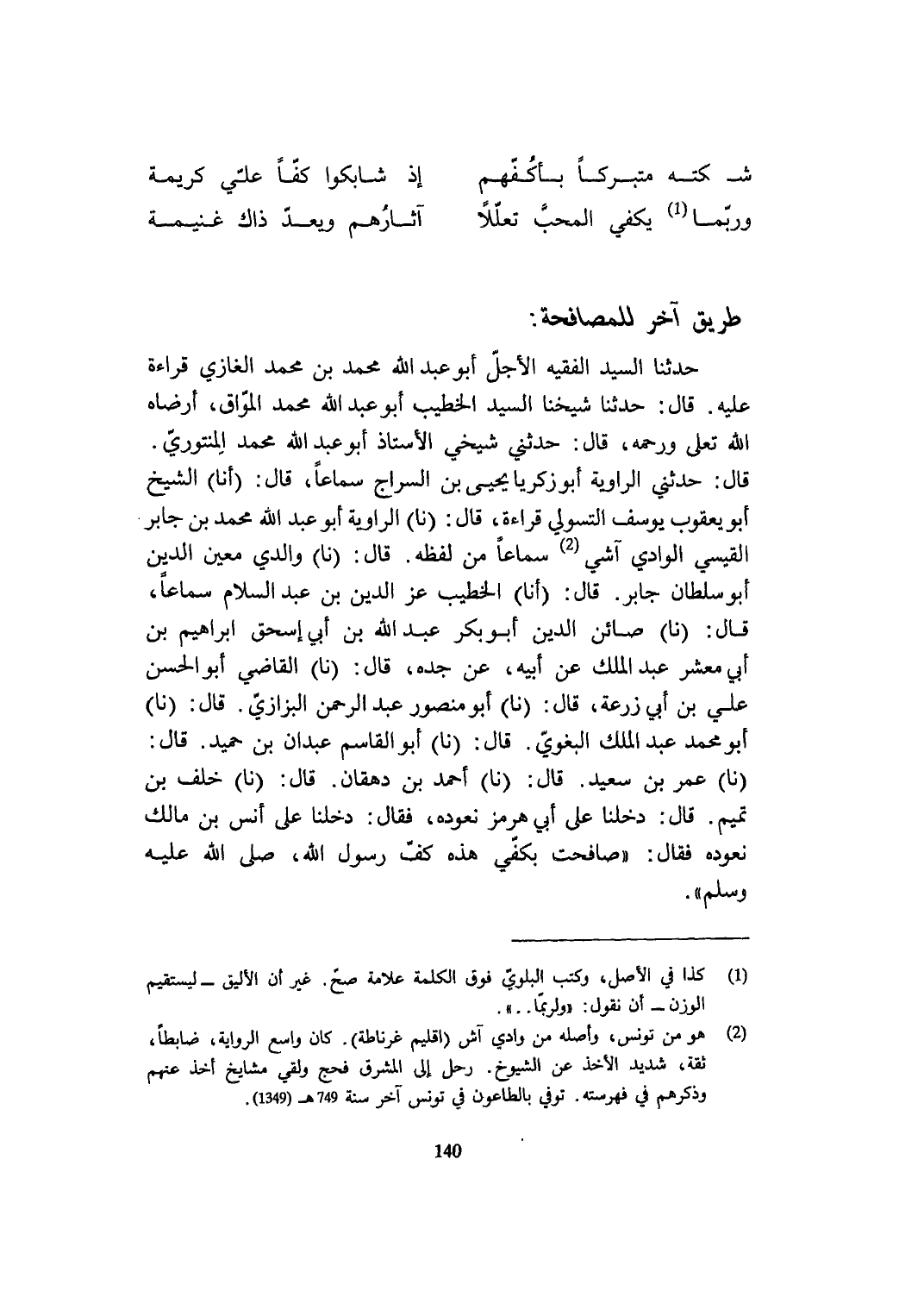 حَدثنَا السَّيِّد الْفَقِيه الْأَجَل أَبُو عبد الله مُحَمَّد بن مُحَمَّد الْغَازِي قِرَاءَة عَلَيْهِ قَالَ حَدثنَا شَيخنَا السَّيِّد الْخَطِيب أَبُو عبد الله مُحَمَّد الْمواق أرضاه الله تعلى ورحمه قَالَ حَدثنِي شَيْخي الْأُسْتَاذ أَبُو عبد الله مُحَمَّد المنتوري قَالَ حَدثنِي الراوية أَبُو زَكَرِيَّا يحيى بن السراج سَمَاعا قَالَ أَنا الشَّيْخ أَبُو يَعْقُوب يُوسُف التسولي قِرَاءَة قَالَ نَا الراوية أَبُو عبد الله مُحَمَّد بن جَابر الْقَيْسِي الْوَادي آشي سَمَاعا من لَفظه قَالَ نَا وَالِدي معِين الدّين أَبُو سُلْطَان جَابر قَالَ أَنا الْخَطِيب عز الدّين بن عبد السَّلَام سَمَاعا قَالَ نَا صائن الدّين أَبُو بكر عبد الله بن أبي إِسْحَق ابراهيم بن أبي معشر عبد الْملك عَن أَبِيه عَن جده قَالَ نَا القَاضِي أَبُو الْحسن عَليّ بن أبي زرْعَة قَالَ نَا أَبُو مَنْصُور عبد الرَّحْمَن البزازي قَالَ نَا أَبُو مُحَمَّد عبد الْملك الْبَغَوِيّ قَالَ نَا أَبُو الْقَاسِم عَبْدَانِ بن حميد قَالَ نَا عمر بن سعيد قَالَ نَا أَحْمد بن دهقان قَالَ نَا خلف بن تَمِيم قَالَ دَخَلنَا على أبي هُرْمُز نعوده فَقَالَ دَخَلنَا على أنس بن مَالك نعوده فَقَالَ صافحت بكفي هَذِه كف رَسُول الله صلى الله عَلَيْهِ وَسلم