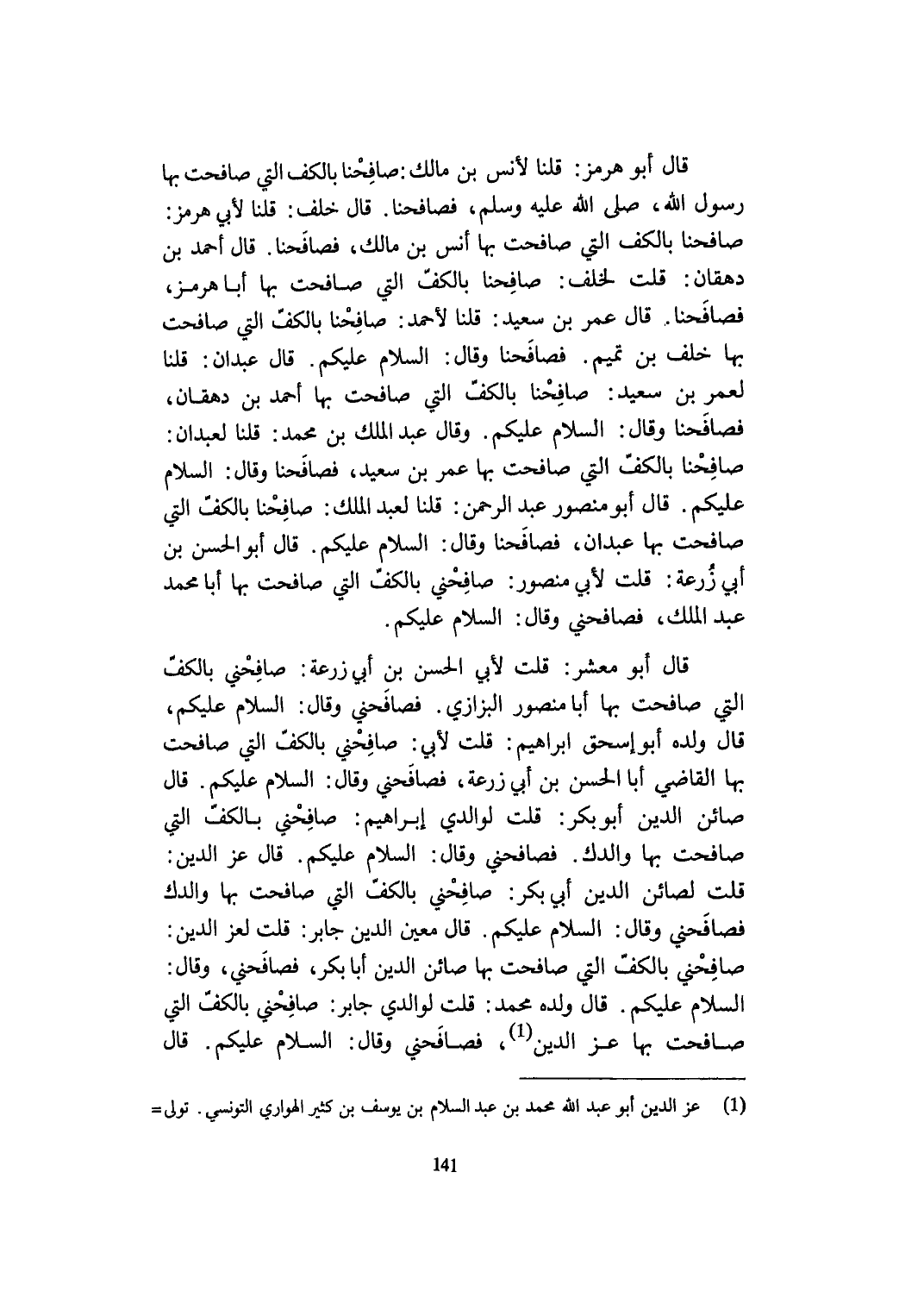 قَالَ أَبُو معشر قلت لأبي الْحسن بن أبي زرْعَة صَافَحَنِي بالكف الَّتِي صافحت بهَا أَبَا مَنْصُور البزازي فصافحني وَقَالَ السَّلَام عَلَيْكُم قَالَ وَلَده أَبُو إِسْحَق ابراهيم قلت لأبي صَافَحَنِي بالكف الَّتِي صافحت بهَا القَاضِي أَبَا الْحسن بن أبي زرْعَة فصافحني وَقَالَ السَّلَام عَلَيْكُم وَقَالَ صائن الدّين أَبُو بكر قلت لوالدي إِبْرَاهِيم صَافَحَنِي بالكف الَّتِي صافحت بهَا والدك فصافحني وَقَالَ السَّلَام عَلَيْكُم قَالَ عز الدّين قلت لصائن الدّين أبي بكر صَافَحَنِي بالكف الَّتِي صافحت بهَا والدك فصافحني وَقَالَ السَّلَام عَلَيْكُم قَالَ معِين الدّين جَابر قلت لعز الدّين صَافَحَنِي بالكف الَّتِي صافحت بهَا صائن الدّين أَبَا بكر فصافحني وَقَالَ السَّلَام عَلَيْكُم قَالَ وَلَده مُحَمَّد قلت لوالدي جَابر صَافَحَنِي بالكف الَّتِي صافحت بهَا عز الدّين فصافحني وَقَالَ السَّلَام عَلَيْكُم قَالَ