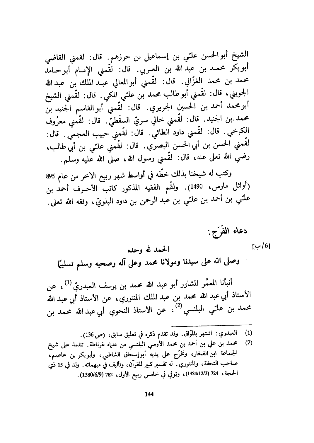 الشَّيْخ أَبُو الْحسن عَليّ بن إِسْمَاعِيل بن حرزهم قَالَ لقمني القَاضِي أَبُو بكر مُحَمَّد بن عبد الله بن الْعَرَبِيّ قَالَ لقمني الإِمَام أَبُو حَامِد مُحَمَّد بن مُحَمَّد الْغَزالِيّ قَالَ لقمني أَبُو الْمَعَالِي عبد الْملك بن عبد الله الْجُوَيْنِيّ قَالَ لقمني أَبُو طَالب مُحَمَّد بن عَليّ الْمَكِّيّ قَالَ لقمني الشَّيْخ أَبُو مُحَمَّد أَحْمد بن الْحُسَيْن الْجريرِي قَالَ لقمني أَبُو الْقَاسِم الْجُنَيْد من مُحَمَّد بن الْجُنَيْد قَالَ لقمني خَالِي سري السَّقطِي قَالَ لقمني مَعْرُوف الْكَرْخِي قَالَ لقمني دَاوُد الطَّائِي قَالَ لقمني حبيب العجمي قَالَ لقمني الْحسن بن أبي الْحسن الْبَصْرِيّ قَالَ لقمني عَليّ بن أبي طَالب رَضِي الله تَعَالَى عَنهُ قَالَ لقمني رَسُول الله صلى الله عَلَيْهِ وَسلم