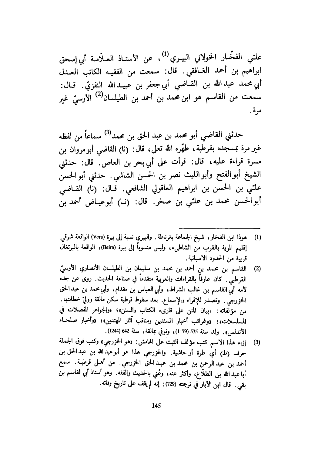 عَليّ الفخار الْخَولَانِيّ البيري عَن الْأُسْتَاذ الْعَلامَة أبي إِسْحَق ابراهيم بن أَحْمد الغافقي قَالَ سَمِعت من الْفَقِيه الْكَاتِب الْعدْل أبي مُحَمَّد عبد الله بن القَاضِي أبي جَعْفَر بن عبيد الله النفزي قَالَ سَمِعت من الْقَاسِم هُوَ ابْن مُحَمَّد بن أَحْمد بن الطيلسان الأوسي غير مرّة
