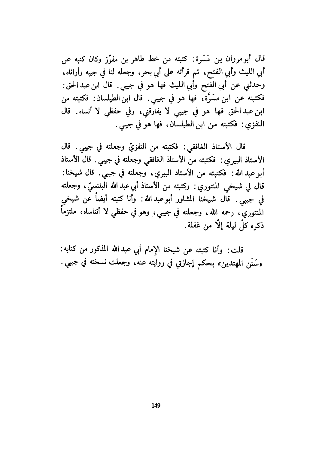 قَالَ أَبُو مَرْوَان بن مَسَرَّة كتبته من خطّ طَاهِر بن مفوز وَكَانَ كتبه عَن أبي اللَّيْث وَأبي الْفَتْح ثمَّ قرأته على أبي بَحر وَجعله لنا فِي جيبه وأراناه وحَدثني عَن أبي الْفَتْح وَأبي اللَّيْث فها هُوَ فِي جيبي قَالَ ابْن عبد الْحق فكتبته عَن ابْن مَسَرَّة فها هُوَ فِي جيبي قَالَ ابْن الطيلسان فكتبته من ابْن عبد الْحق فها هُوَ فِي جيبي لَا يفارقني وَفِي حفظي لَا أنساه قَالَ النفزي فكتبته من ابْن الطيلسان فها هُوَ فِي جيبي