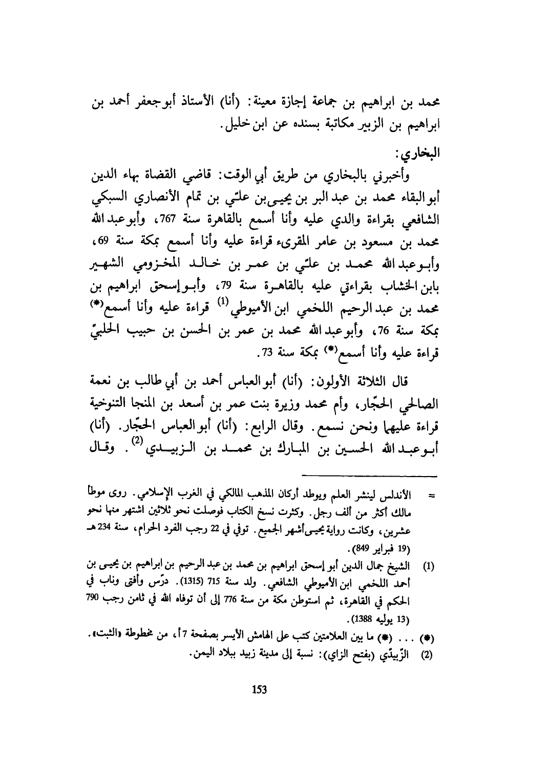 وَأَخْبرنِي بالبخاري من طَرِيق أبي الْوَقْت قَاضِي الْقُضَاة بهاء الدّين أَبُو الْبَقَاء مُحَمَّد بن عبد الْبر بن يحيى بن عَليّ بن تَمام الْأنْصَارِيّ السُّبْكِيّ الشَّافِعِي بِقِرَاءَة وَالِدي عَلَيْهِ وَأَنا أسمع بِالْقَاهِرَةِ سنة 767 وَأَبُو عبد الله مُحَمَّد بن مَسْعُود بن عَامر المقرىء قِرَاءَة عَلَيْهِ وَأَنا أسمع بِمَكَّة سنة 69 وَأَبُو عبد الله مُحَمَّد بن عَليّ بن عمر بن خَالِد المَخْزُومِي الشهير بِابْن الخشاب بِقِرَاءَتِي عَلَيْهِ بِالْقَاهِرَةِ سنة 79 وَأَبُو إِسْحَق ابراهيم بن مُحَمَّد بن عبد الرَّحِيم اللَّخْمِيّ ابْن الأميوطي قِرَاءَة عَلَيْهِ وَأَنا أسمع بِمَكَّة سنة 76 وَأَبُو عبد الله مُحَمَّد بن عمر بن الْحسن بن حبيب الْحلَبِي قِرَاءَة عَلَيْهِ وَأَنا أسمع بِمَكَّة سنة 73