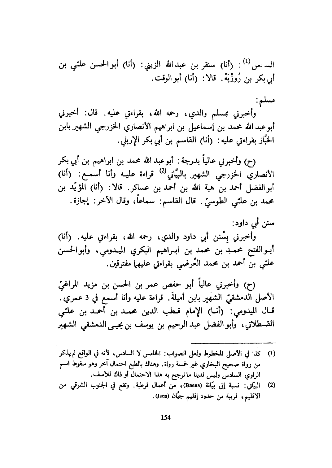 وَأَخْبرنِي بسنن أبي دَاوُد وَالِدي رَحمَه الله بِقِرَاءَتِي عَلَيْهِ أَنا أَبُو الْفَتْح مُحَمَّد بن مُحَمَّد بن ابراهيم الْبكْرِيّ الْمَيْدُومِيُّ وَأَبُو الْحسن عَليّ بن أَحْمد بن مُحَمَّد العرضي بِقِرَاءَتِي عَلَيْهِمَا مفترقين