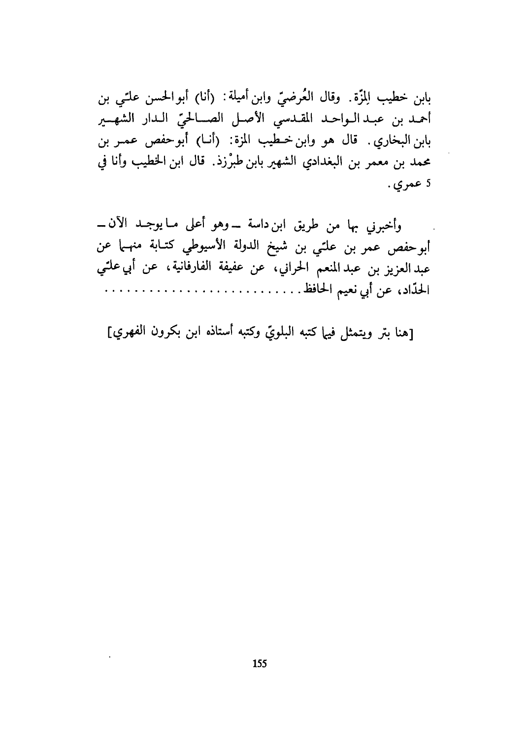 بِابْن خطيب المزة وَقَالَ العرضي وَابْن أميلة أَنا أَبُو الْحسن عَليّ بن أَحْمد بن عبد الْوَاحِد الْمَقْدِسِي الأَصْل الصَّالِحِي الدَّار الشهير بِابْن البُخَارِيّ قَالَ هُوَ وَابْن خطيب المزة أَنا أَبُو حَفْص عمر بن مُحَمَّد بن معمر بن الْبَغْدَادِيّ الشهير بِابْن طبرزذ قَالَ ابْن الْخَطِيب وَأَنا فِي 5 عمري
