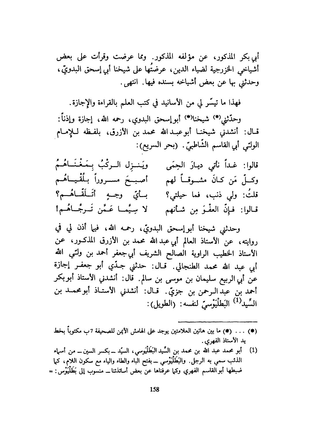 وحَدثني شَيخنَا أَبُو إِسْحَق البدوي رَحمَه الله فِيمَا أذن لي فِي رِوَايَته عَن الْأُسْتَاذ الْعَالم أبي عبد الله مُحَمَّد بن الْأَزْرَق الْمَذْكُور عَن الْأُسْتَاذ الْخَطِيب الراوية الصَّالح الشريف أبي جَعْفَر أَحْمد بن ولي الله أبي عبد الله مُحَمَّد الطنجالي قَالَ حَدثنِي جدي أَبُو جَعْفَر إجَازَة عَن أبي الرّبيع سُلَيْمَان بن مُوسَى بن سَالم قَالَ أَنْشدني الْأُسْتَاذ أَبُو بكر أَحْمد بن عبد الرَّحْمَن بن جزي قَالَ أَنْشدني الْأُسْتَاذ أَبُو مُحَمَّد بن السَّيِّد البطليوسي لنَفسِهِ الطَّوِيل