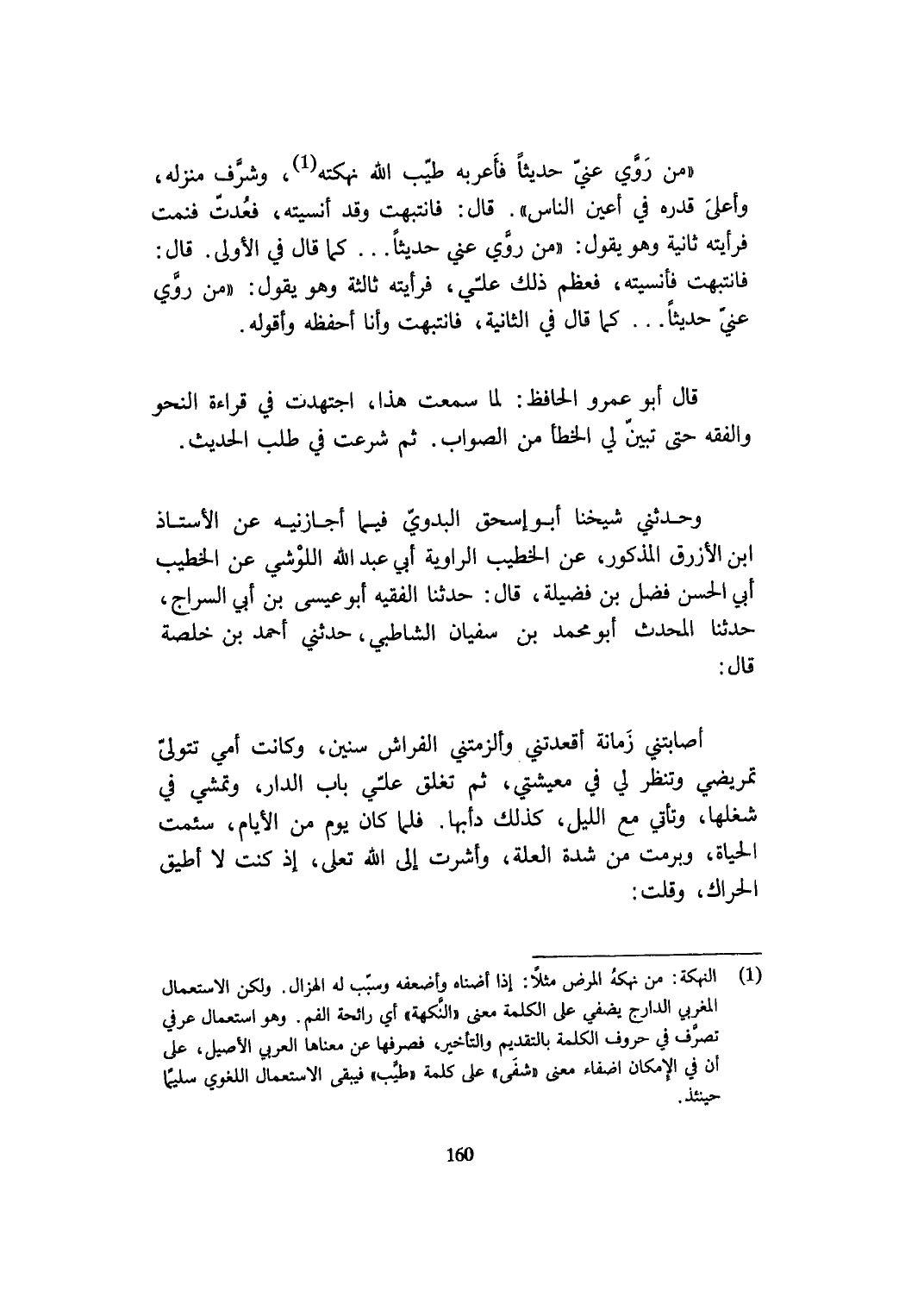 قَالَ أَبُو عَمْرو الْحَافِظ لما سَمِعت هَذَا اجتهدت فِي قِرَاءَة النَّحْو وَالْفِقْه حَتَّى تبين لي الْخَطَأ من الصَّوَاب ثمَّ شرعت فِي طلب الحَدِيث