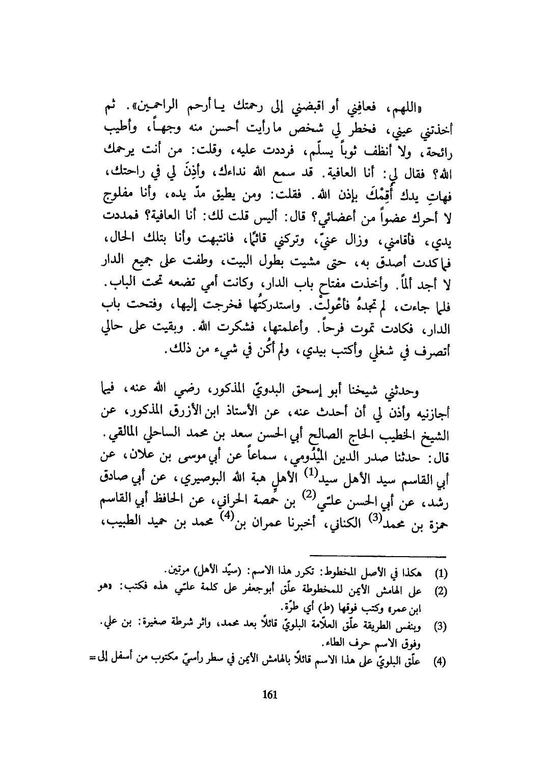 اللَّهُمَّ فعافني أَو اقبضني إِلَى رحمتك يَا أرْحم الرَّاحِمِينَ ثمَّ أخذتني عَيْني فخطر لي شخص مَا رَأَيْت أحسن مِنْهُ وَجها وَأطيب رَائِحَة وَلَا أنظف ثوبا يسلم فَرددت عَلَيْهِ وَقلت من أَنْت يَرْحَمك الله فَقَالَ لي أَنا الْعَافِيَة قد سمع الله نداءك وَأذن لي فِي راحتك فهات يدك أقمك بِإِذن الله فَقلت وَمن يُطيق مد يَده وَأَنا مفلوج لَا أحرك عضوا من أعضائي قَالَ أَلَيْسَ قلت لَك أَنا الْعَافِيَة فمددت يَدي فأقامني وَزَالَ عني وَتَرَكَنِي قَائِما فانتبهت وَأَنا بِتِلْكَ الْحَال فَمَا كدت أصدق بِهِ حَتَّى مشيت بطول الْبَيْت وطفت على جَمِيع الدَّار لَا أجد ألما وَأخذت مِفْتَاح بَاب الدَّار وَكَانَت أُمِّي تضعه تَحت الْبَاب فَلَمَّا جَاءَت لم تَجدهُ فأعولت واستدركتها فَخرجت إِلَيْهَا وَفتحت بَاب الدَّار فَكَادَتْ تَمُوت فَرحا وأعلمتها فَشَكَرت الله وَبقيت على حَالي أتصرف فِي شغلي وأكتب بيَدي وَلم أكن فِي شَيْء من ذَلِك