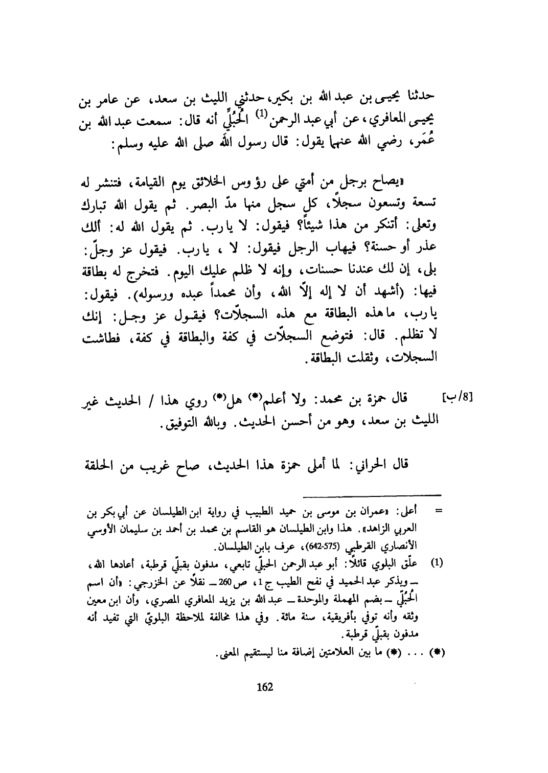 قَالَ حَمْزَة بن مُحَمَّد وَلَا أعلم هَل رُوِيَ هَذَا الحَدِيث غير اللَّيْث بن سعد وَهُوَ من أحسن الحَدِيث وَبِاللَّهِ التَّوْفِيق